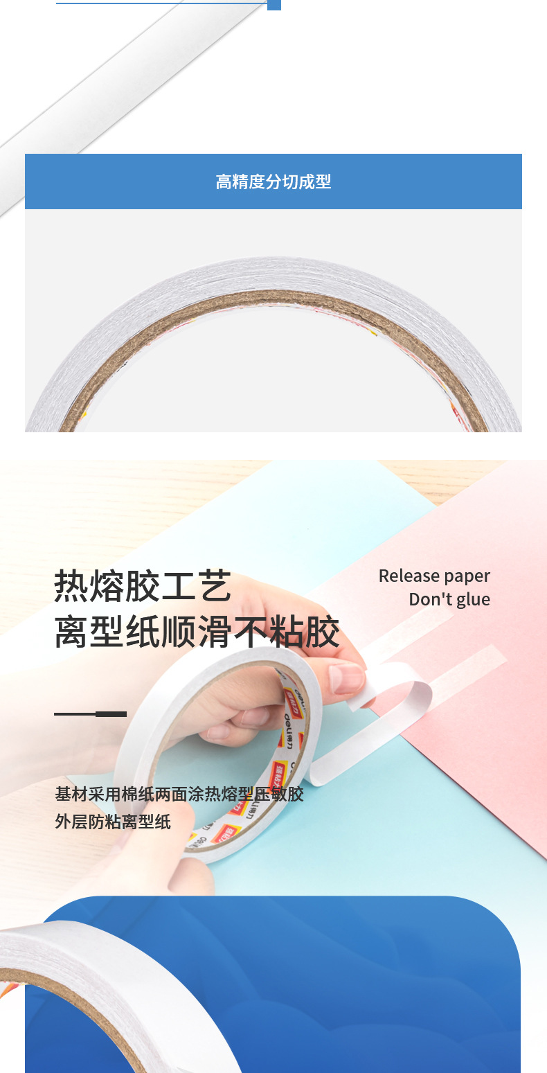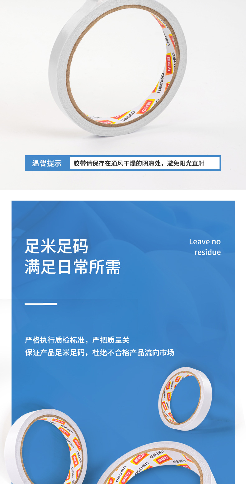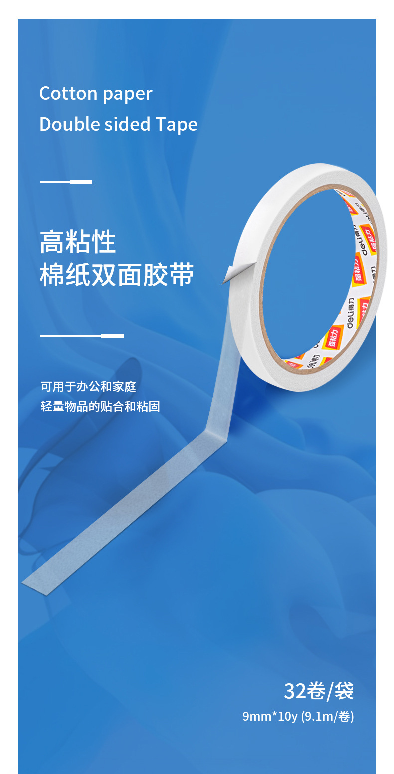 包装清单:1得力双面胶30401双面棉纸胶带12mm白色热熔棉纸胶带办公家用