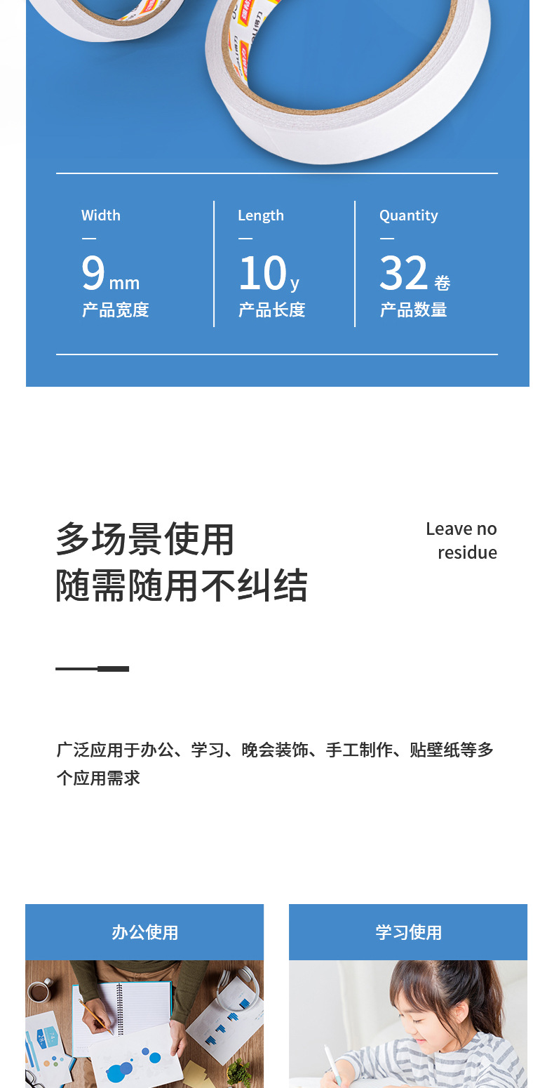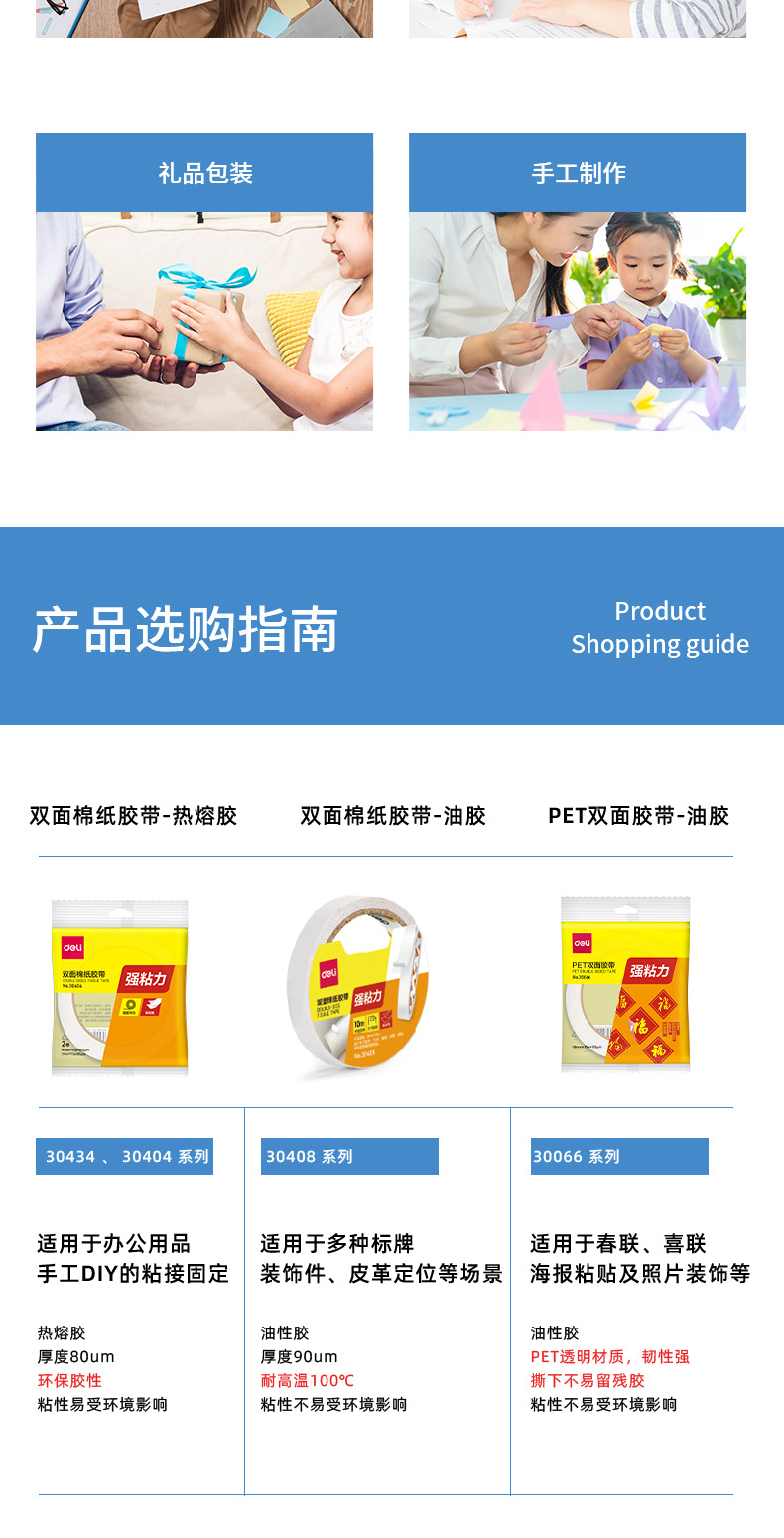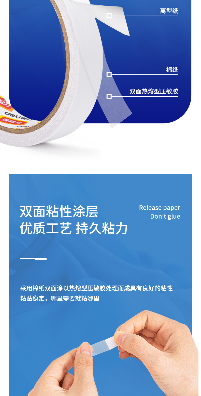 包装清单:1得力双面胶30401双面棉纸胶带12mm白色热熔棉纸胶带办公家用