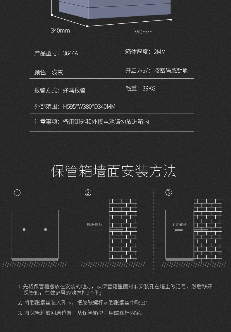 包装清单:1得力 deli 3644A电子密码保管箱 入柜保险箱