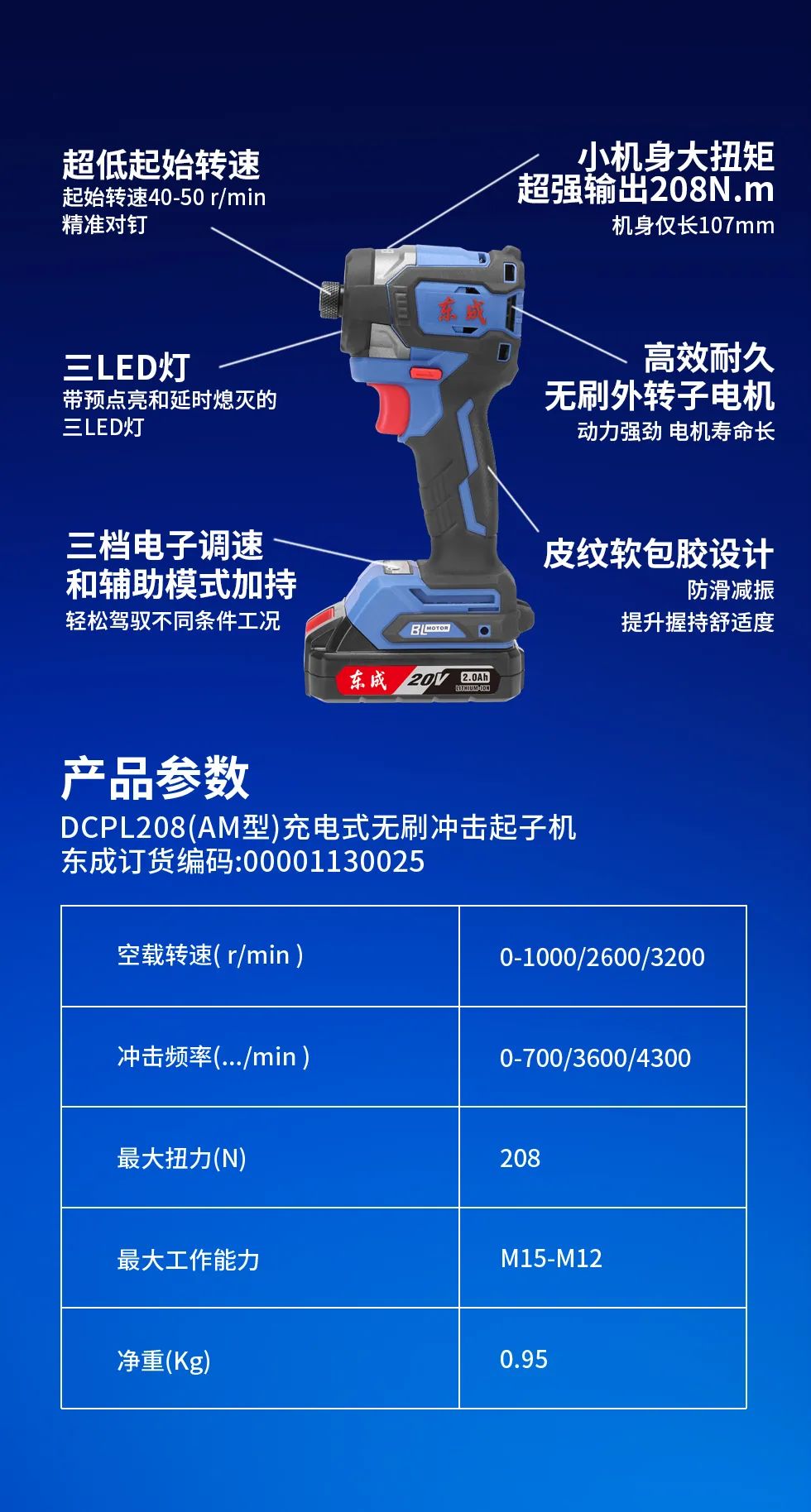 包装清单:1东成充电式无刷冲击起子机DCPL208(AM型)(208N.M)20V2.0ah*2