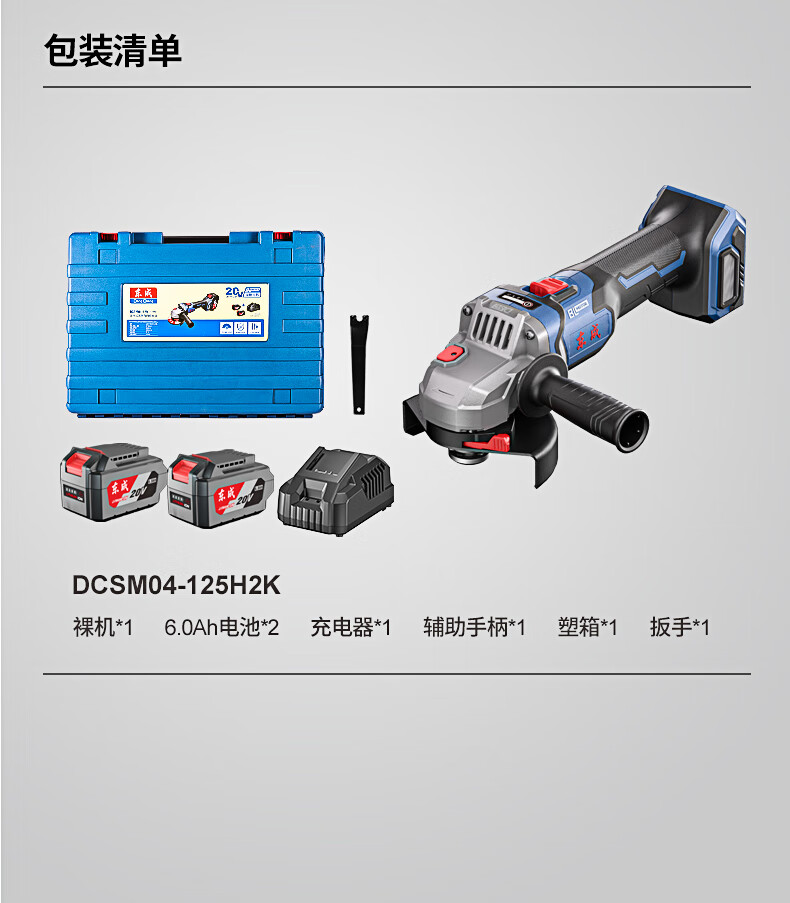 包装清单:1东成充电式无刷角磨机DCSM04-125(H2K型)20V6.0ah*2角磨机锂电磨光机充电式切割机