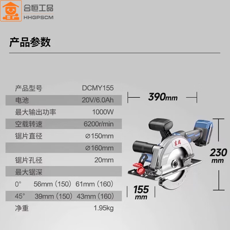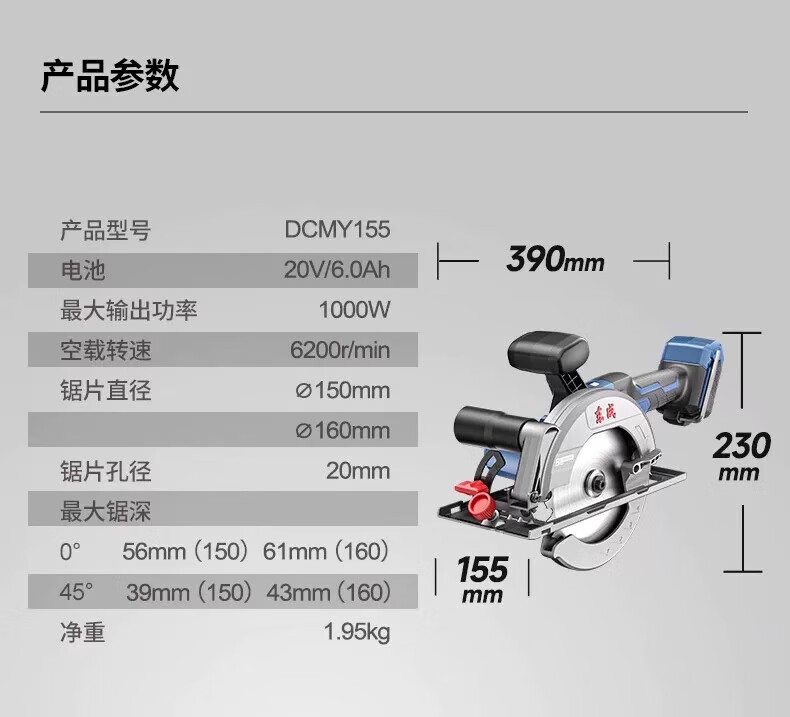 商品名称:东成充电式无刷电圆锯DCMY155(HM型)20V6.0ah单电手提切割机