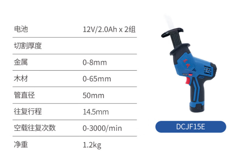 商品名称:东成充电式马刀锯DCJF15(E型)12V2.0ah*2充电式电锯往复锯木工锯金属锯