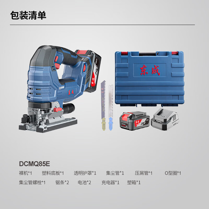 包装清单:1东成充电式无刷曲线锯DCMQ85(E型)20V4.0ah*2充电式手电锯多功能