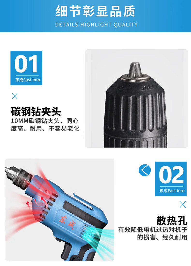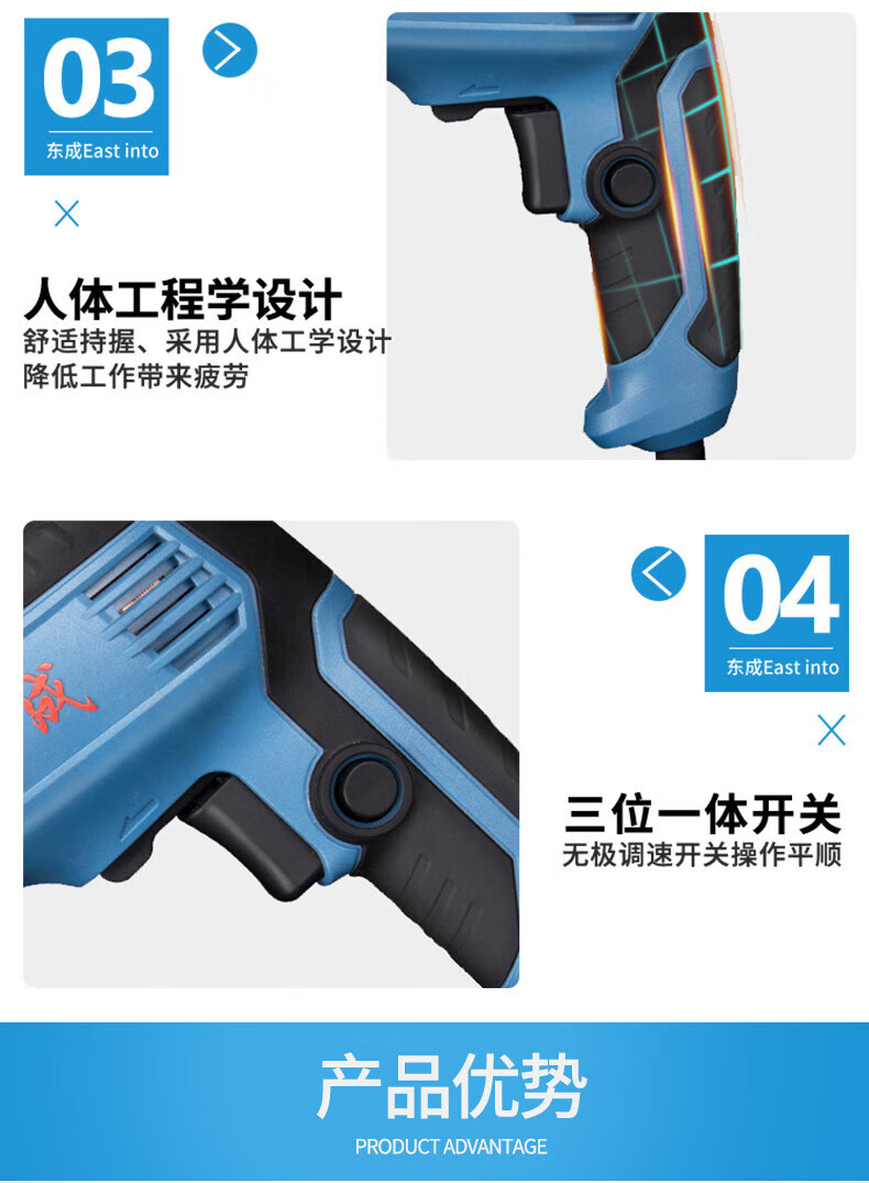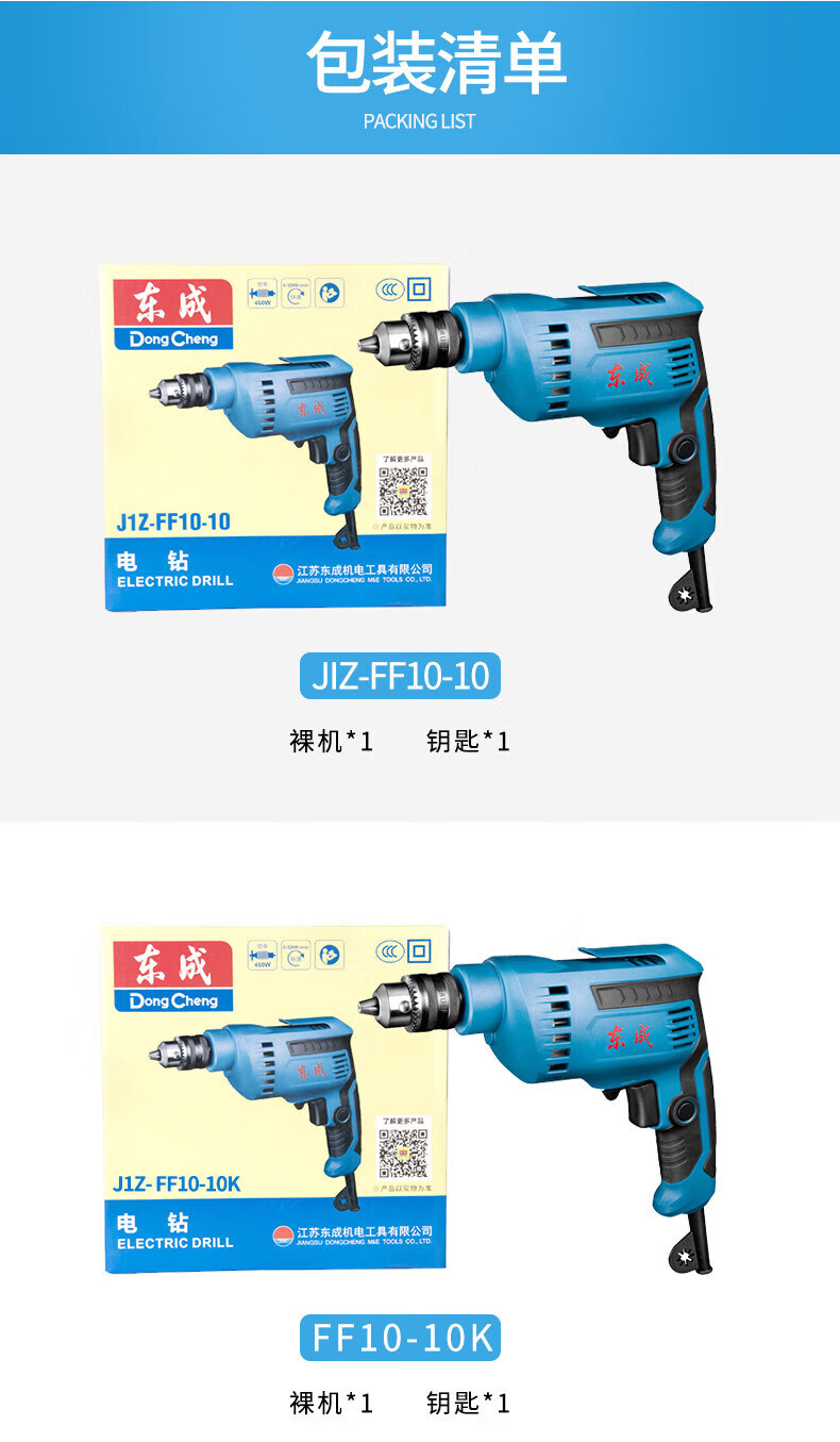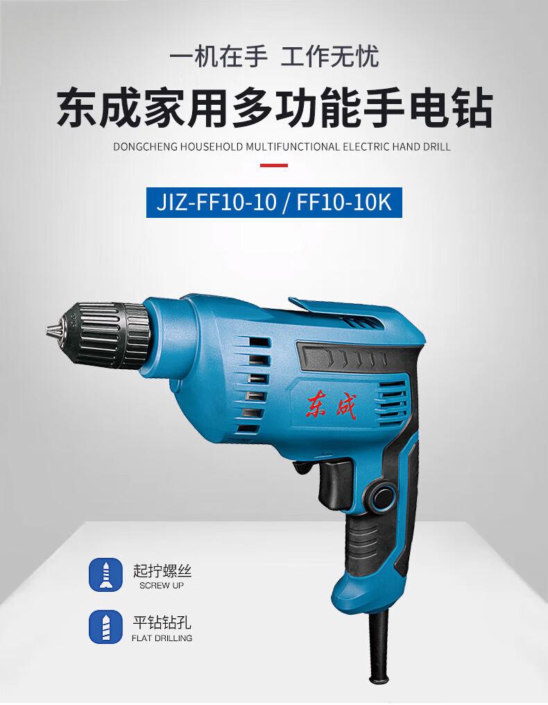 包装清单:1东成电钻J1Z-FF10-10K 460W正反转可调速多功能电钻