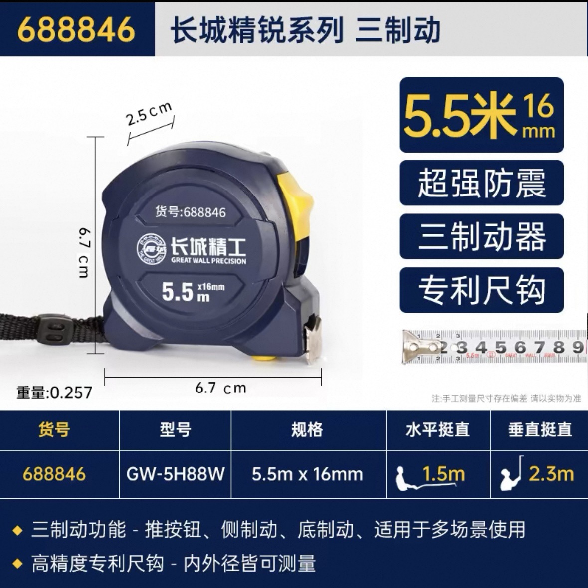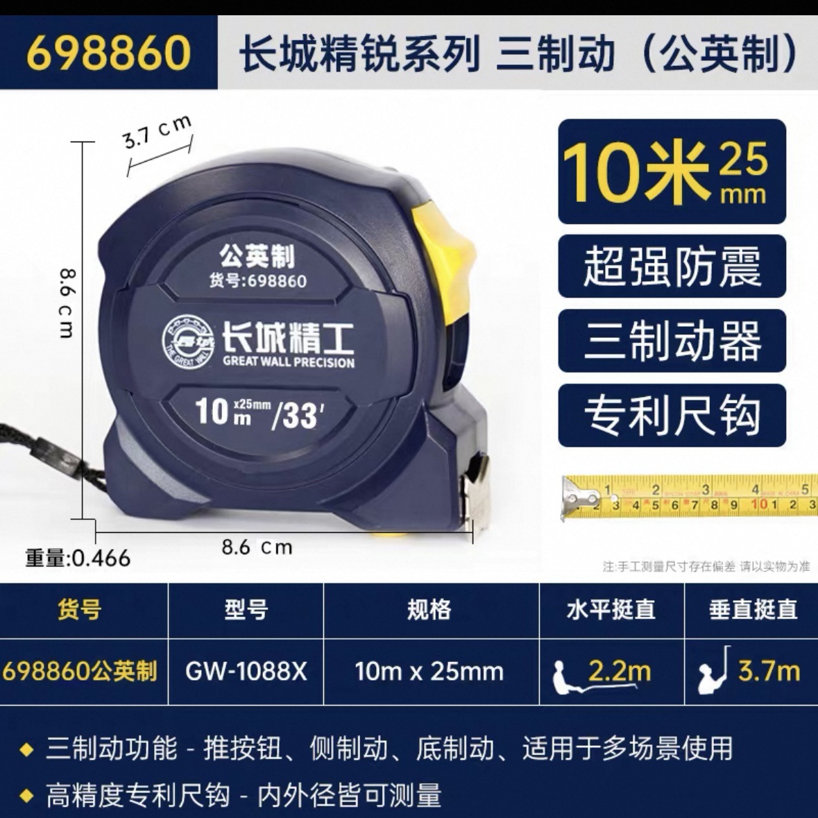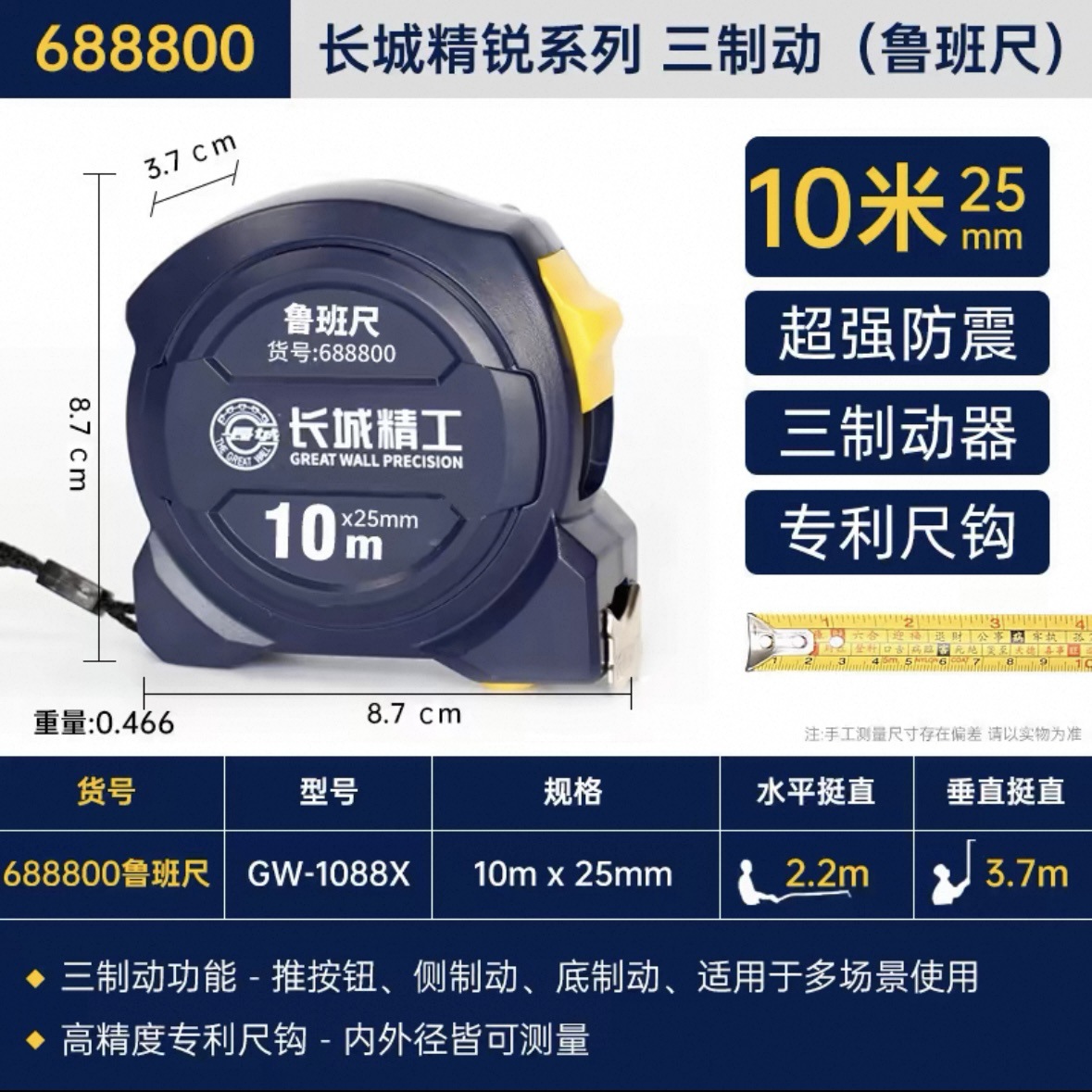 包装清单:1长城精工 盒尺 高碳钢卷尺 多功能三制动公制公英制鲁班尺
