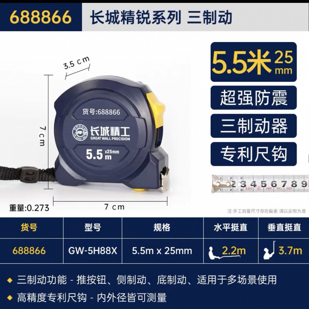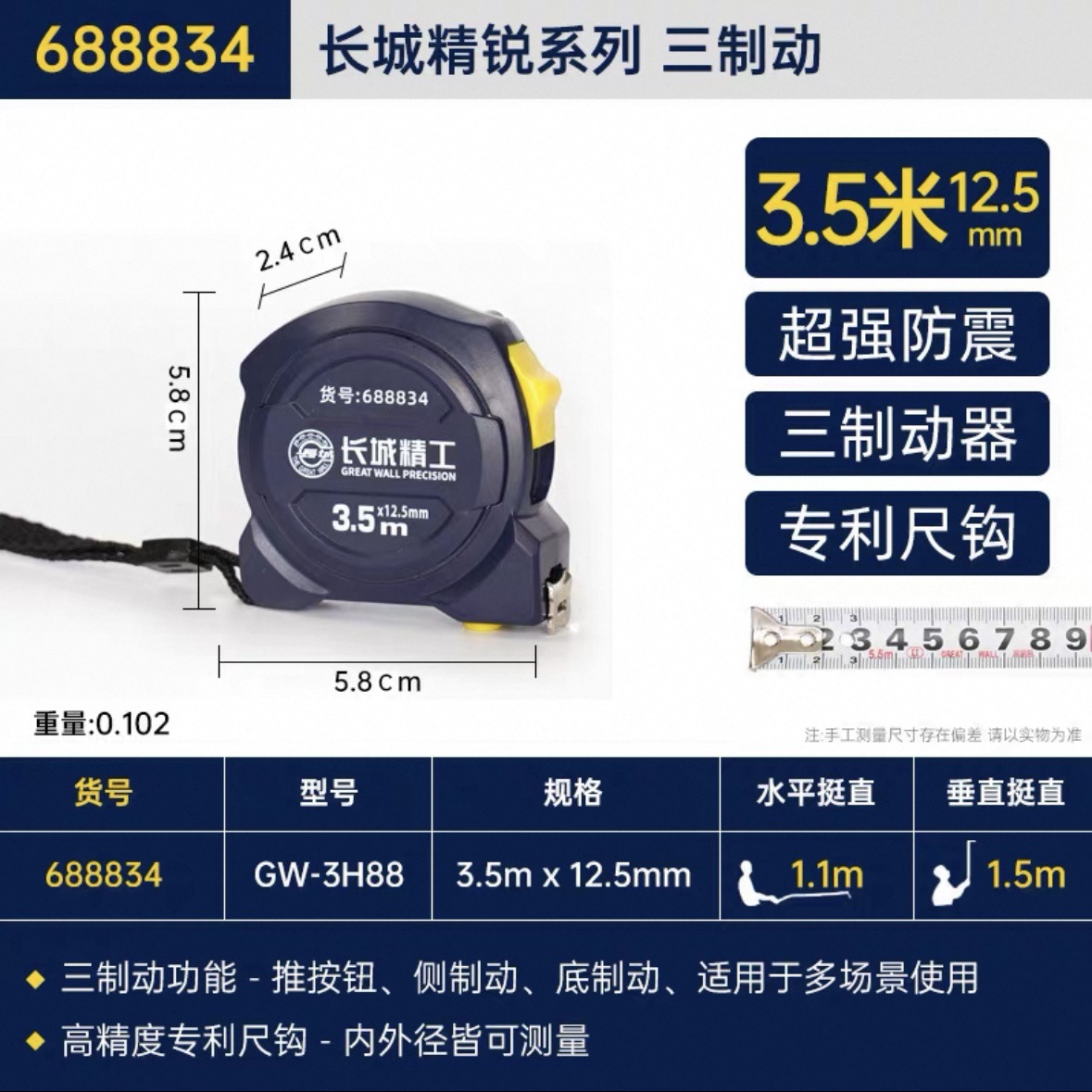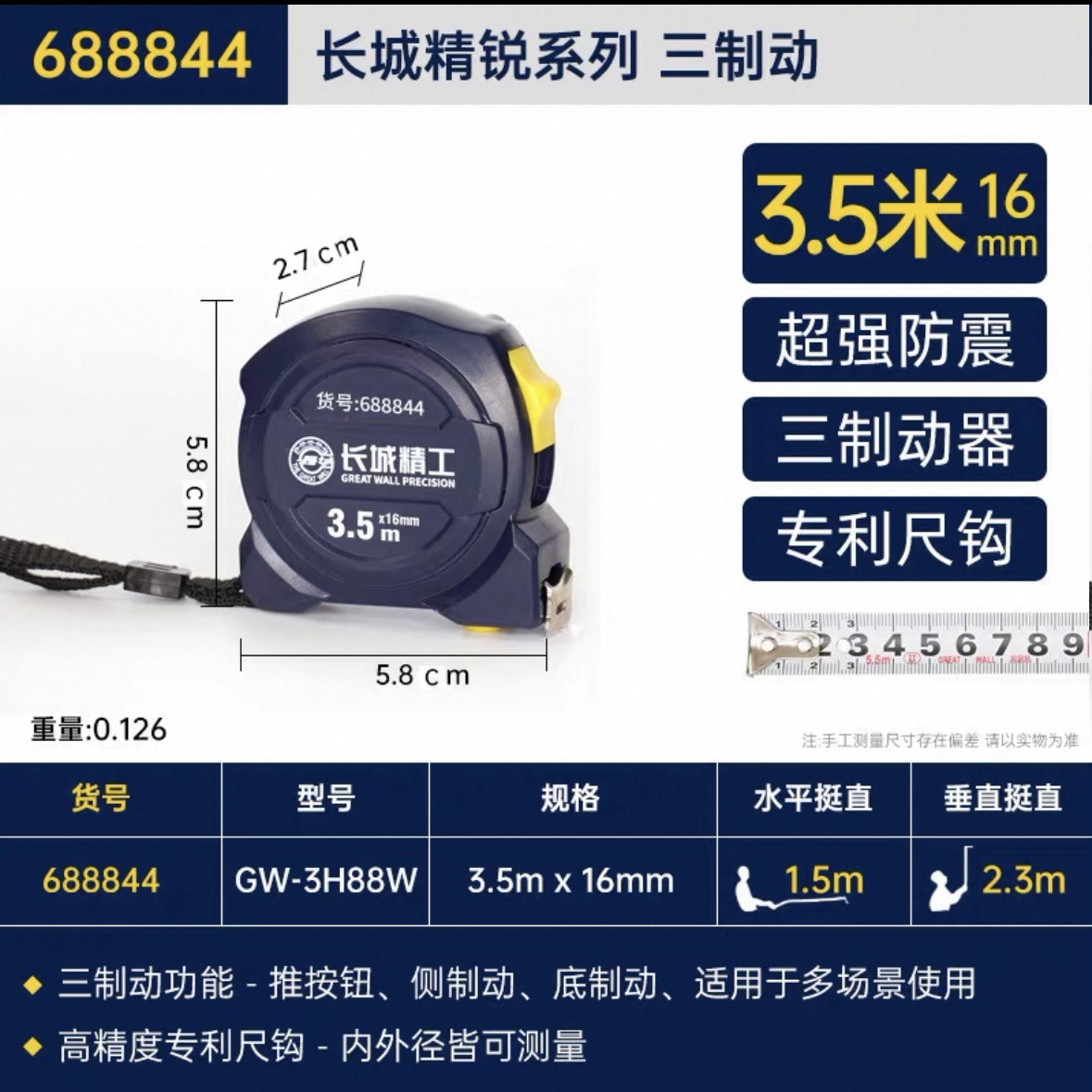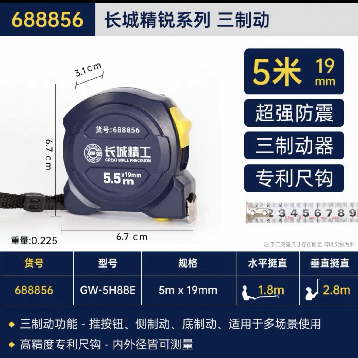 包装清单:1长城精工 盒尺 高碳钢卷尺 多功能三制动公制公英制鲁班尺