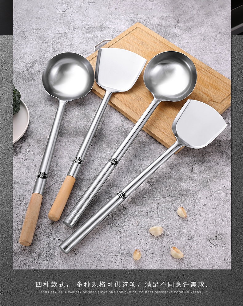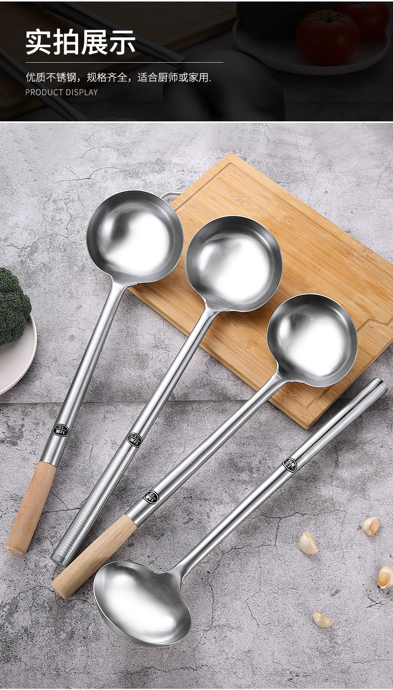 包装清单:1酒店厨师 加厚手勺不锈钢木柄炒勺锅铲 勺子食堂炒菜勺厨房老式铲子