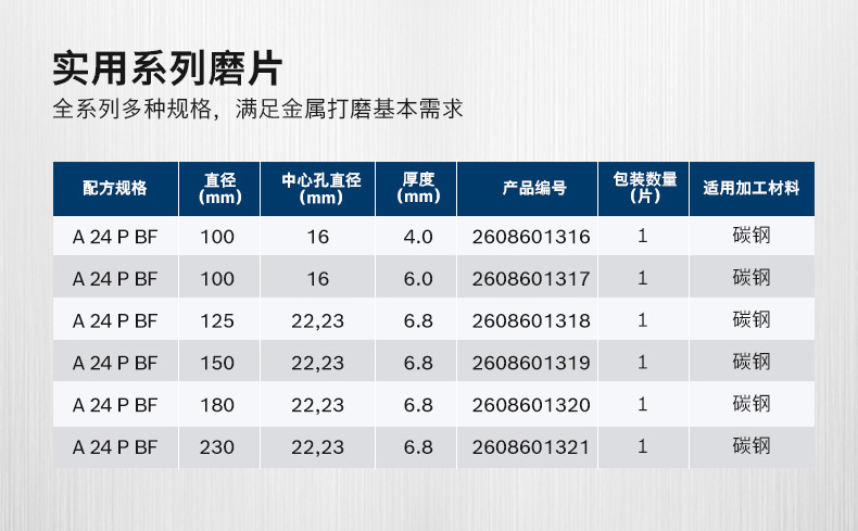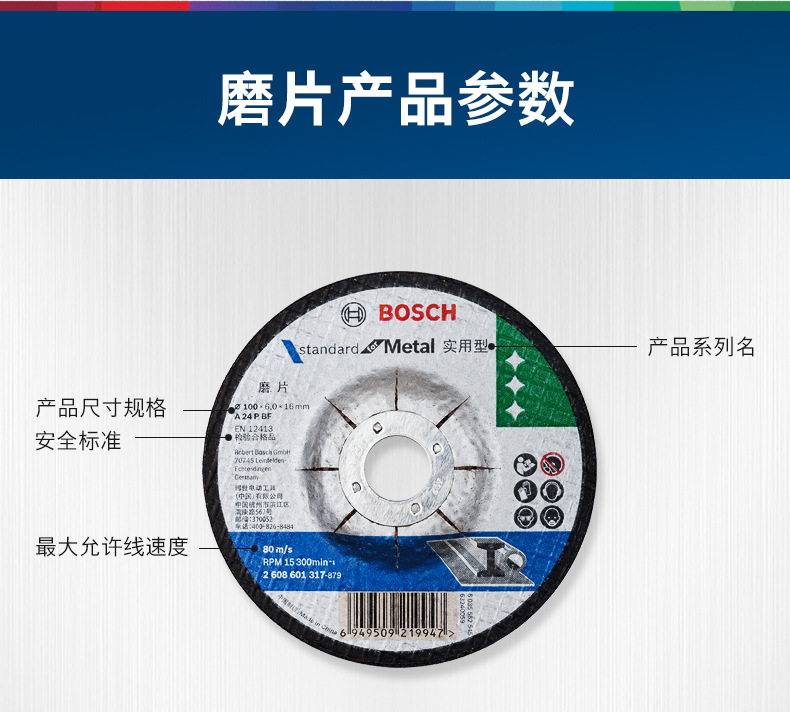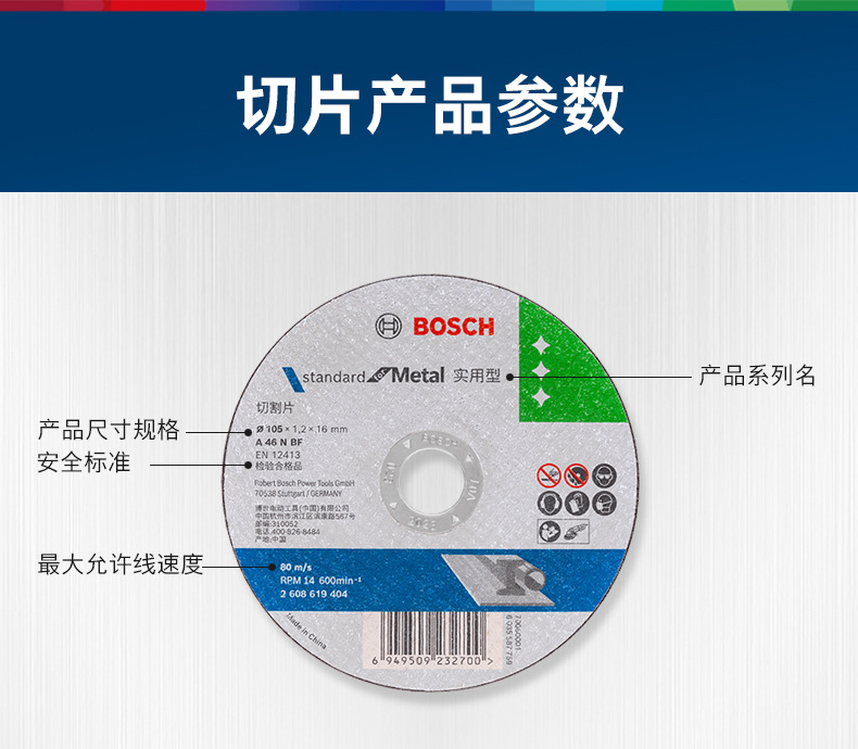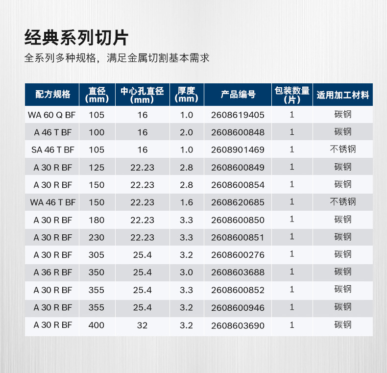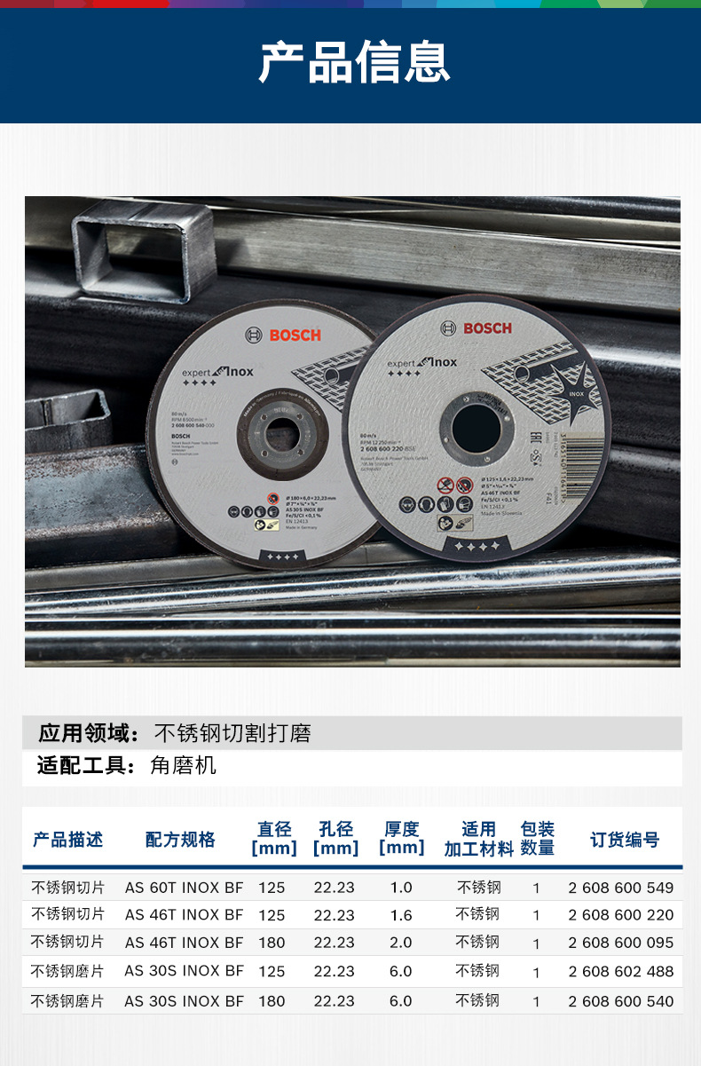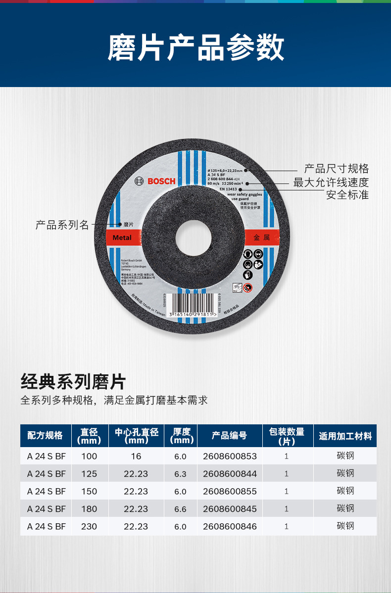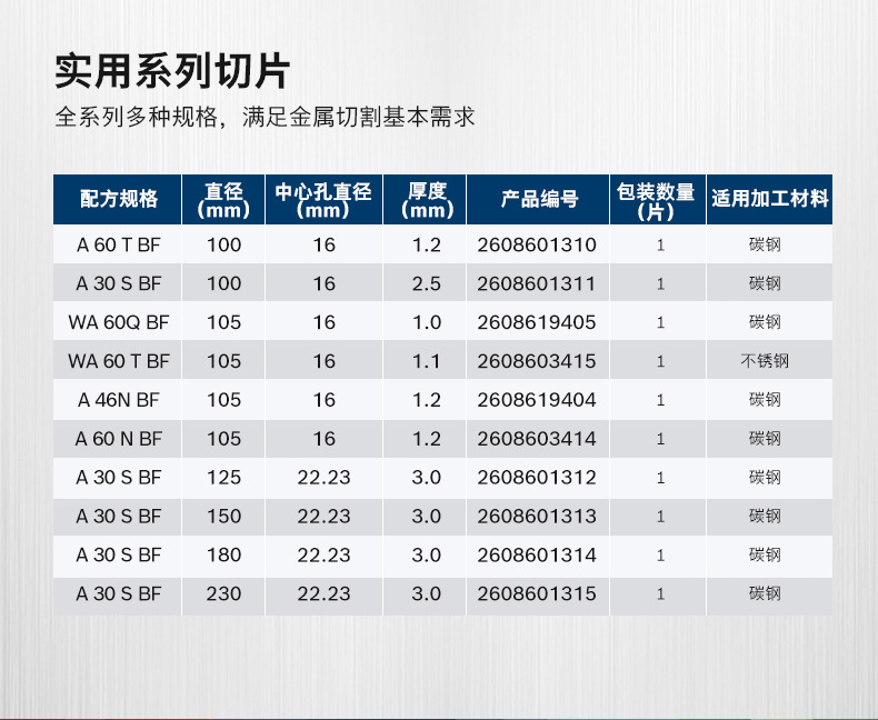 包装清单:1博世 BOSCH 实用系列磨切片 金属切片105*16*1.2mm 金属砂轮切割片