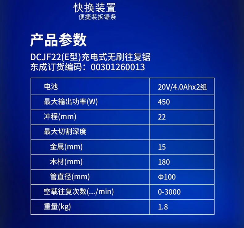 商品名称:东成 DongCheng 充电式无刷往复锯DCJF22(E型)20V4.0ah*2DCJF22(E型)20V4.0ah*2