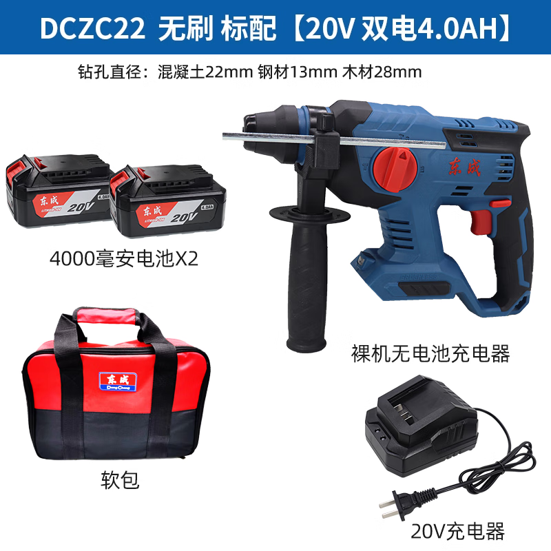 东成充电式无刷电锤DCZC22(B型)20V4.0ah*2三用电捶电镐东城