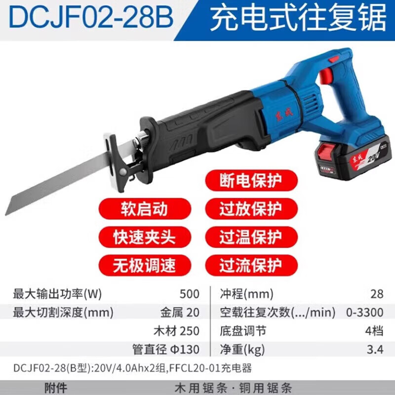 东成充电式无刷往复锯DCJF02-28(B型)20V4.0ah*2木头金属塑料骨头切割锯