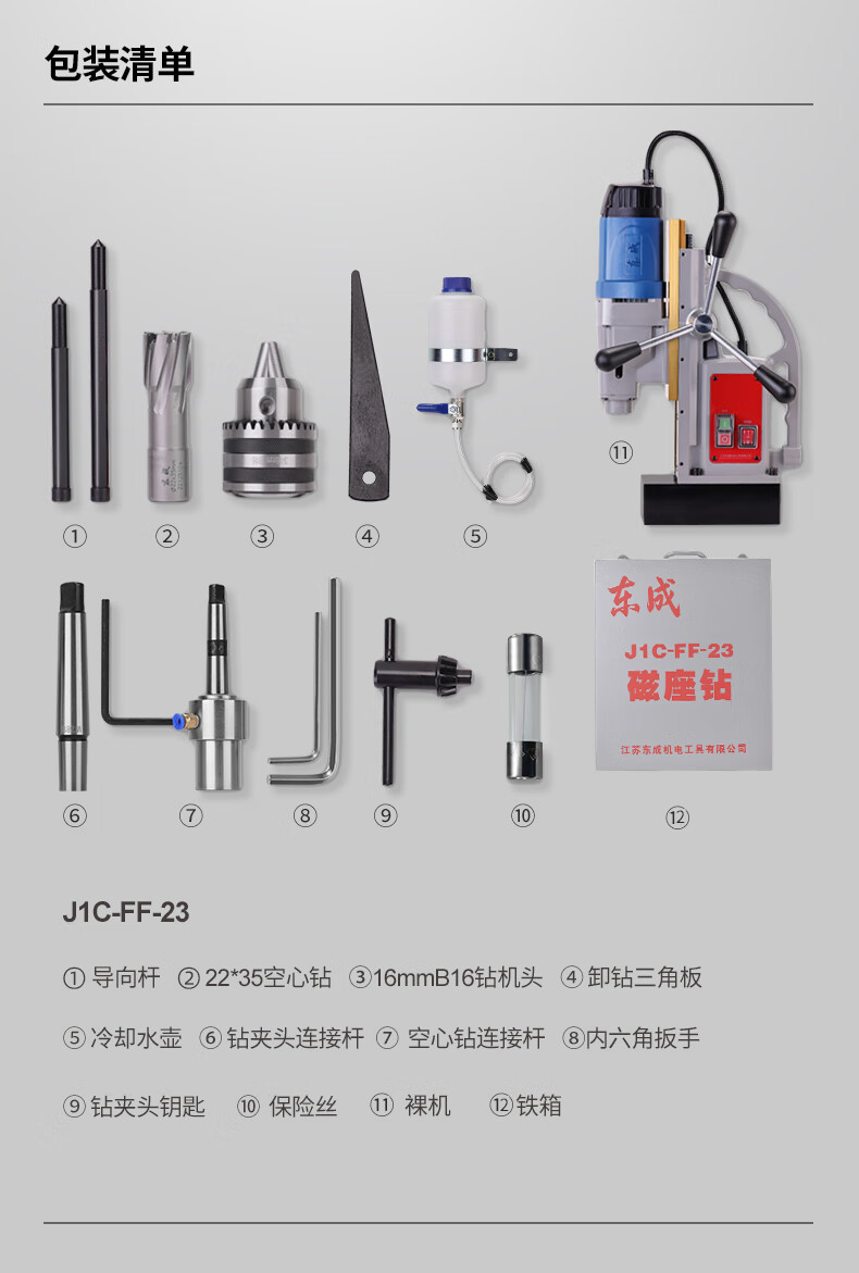 包装清单:1东成磁座钻J1C-FF-23强磁力大功率磁力钻工业级吸铁钻