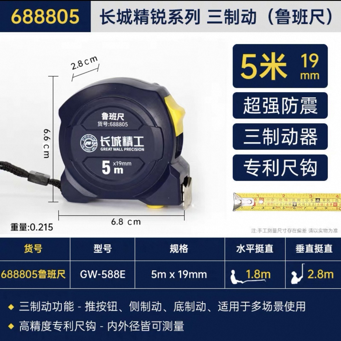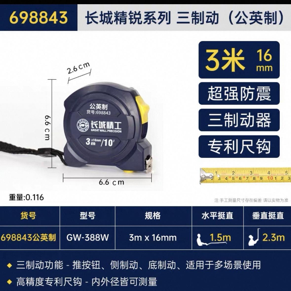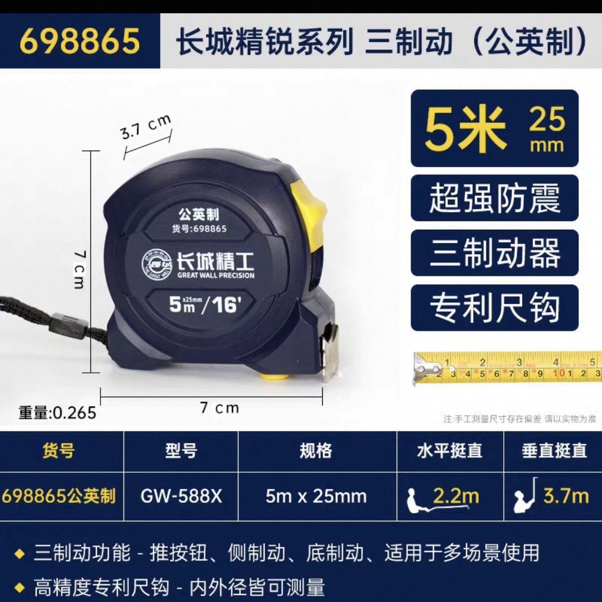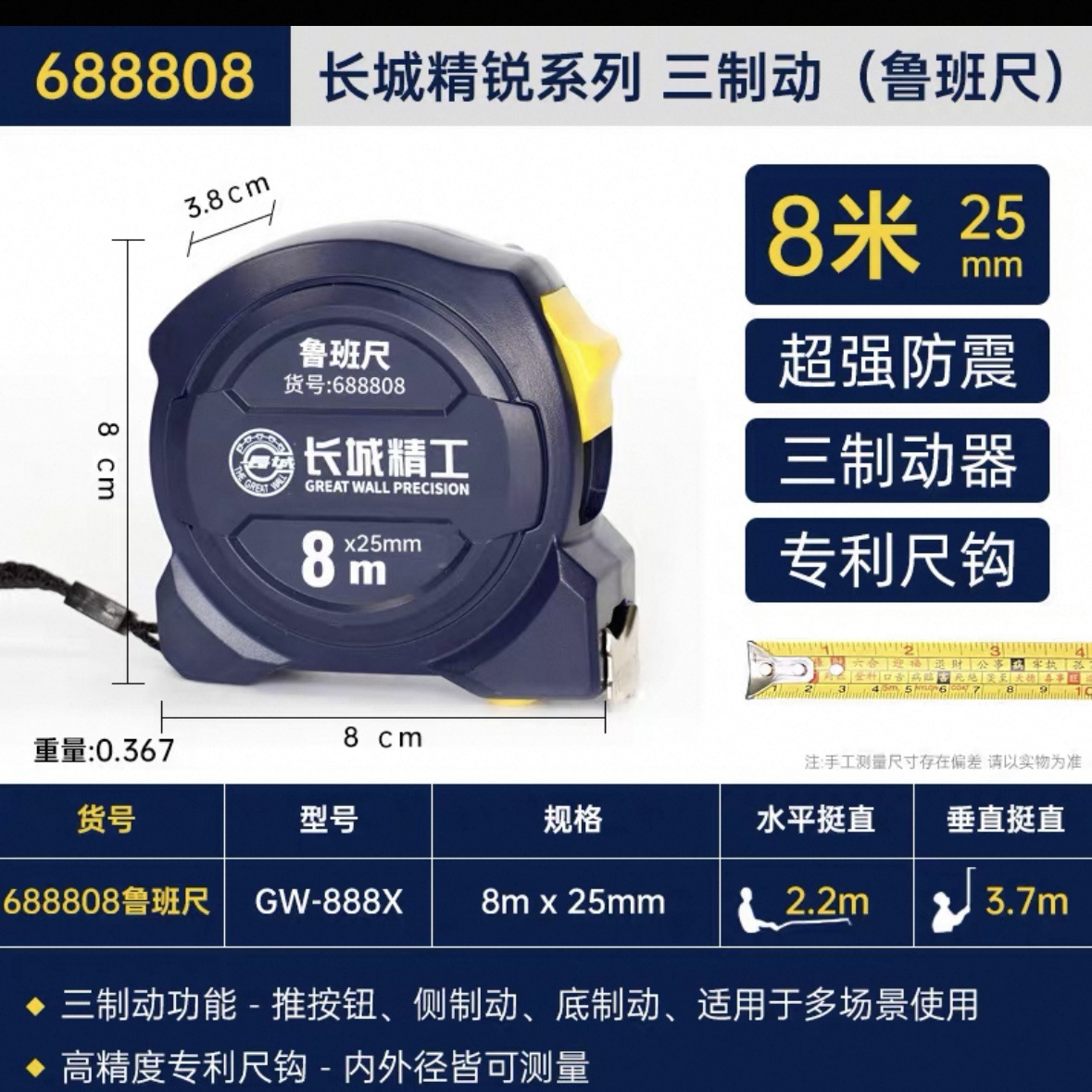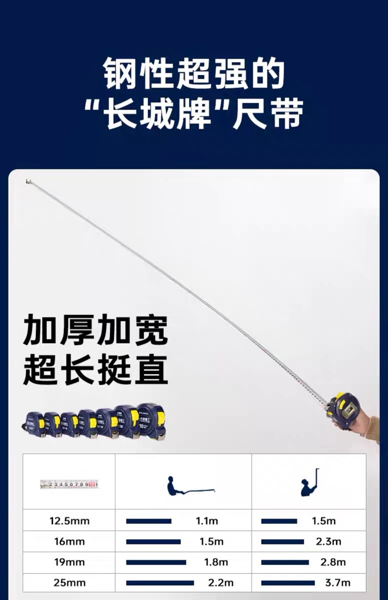 包装清单:1长城精工 盒尺 高碳钢卷尺 多功能三制动公制公英制鲁班尺
