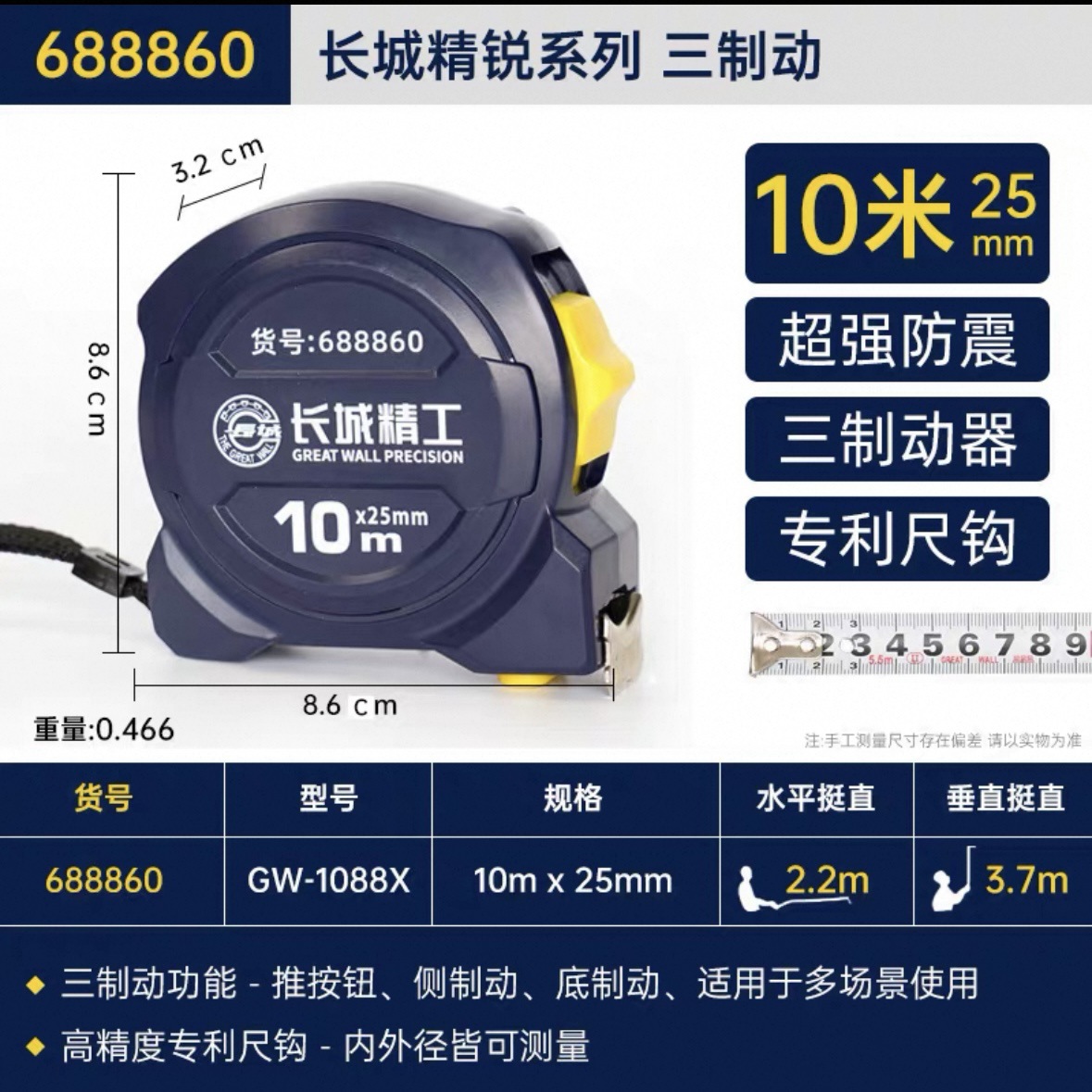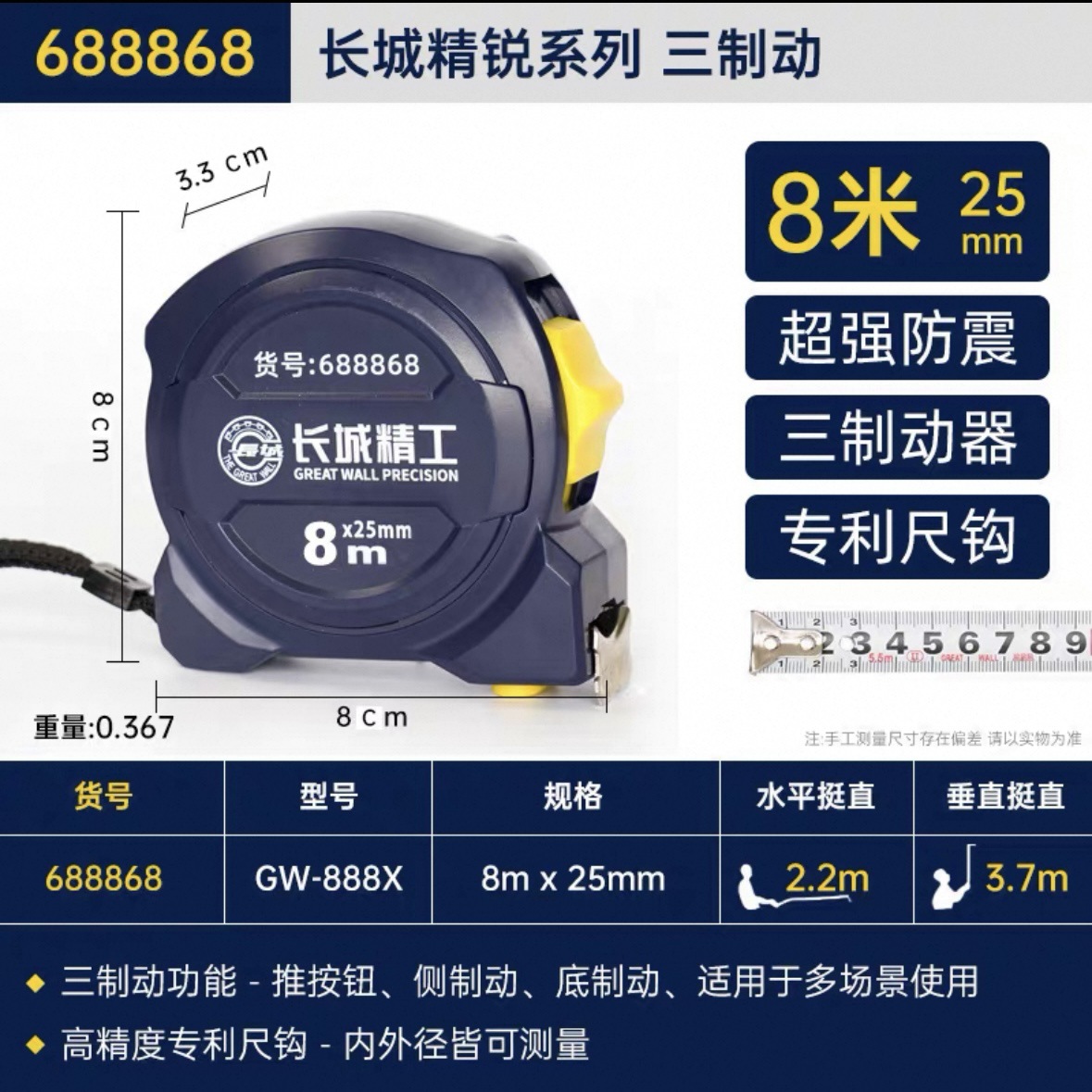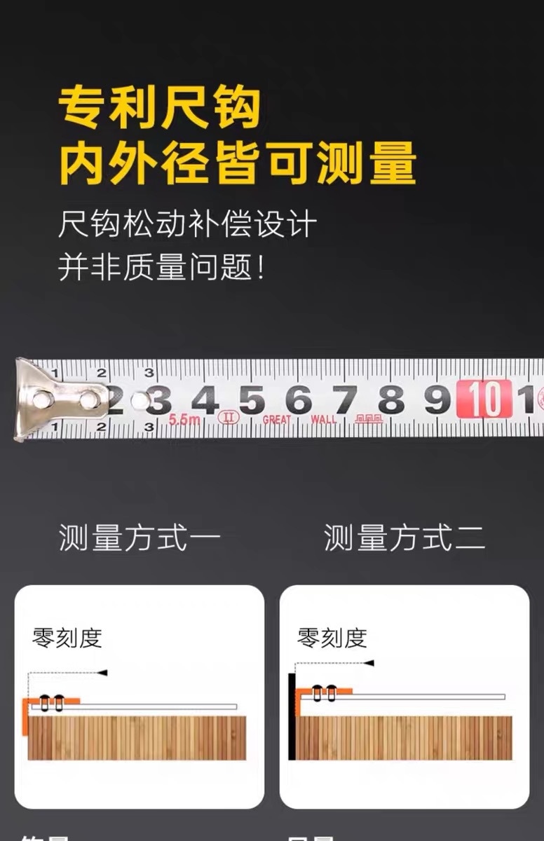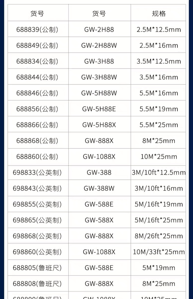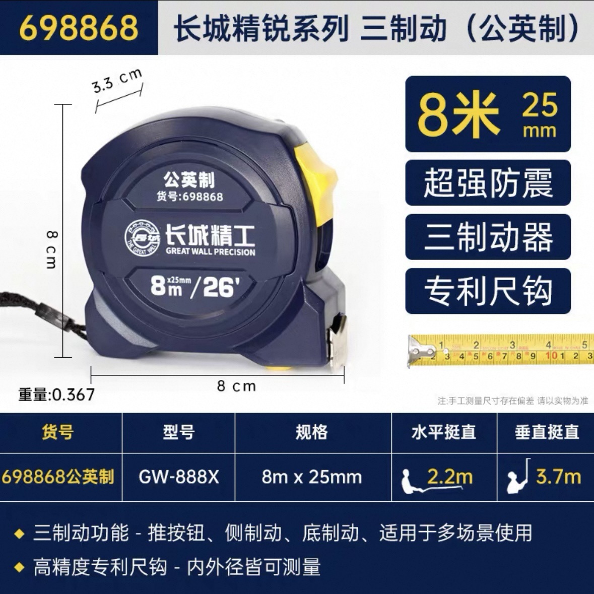 包装清单:1长城精工 盒尺 高碳钢卷尺 多功能三制动公制公英制鲁班尺