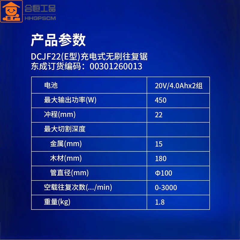 包装清单:1东成 DongCheng 充电式无刷往复锯DCJF22(E型)20V4.0ah*2DCJF22(E型)20V4.0ah*2
