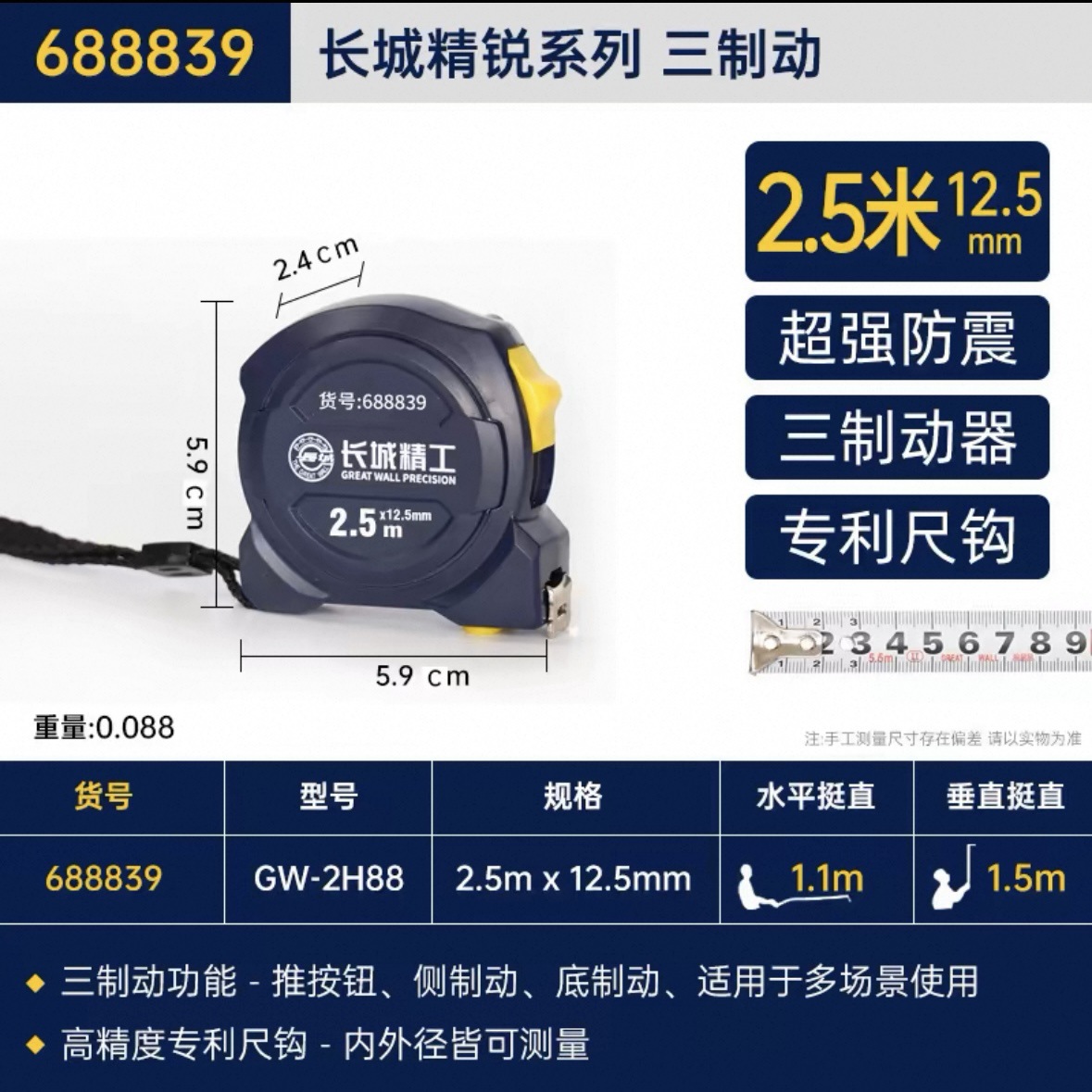 长城精工 盒尺 高碳钢卷尺 多功能三制动公制公英制鲁班尺