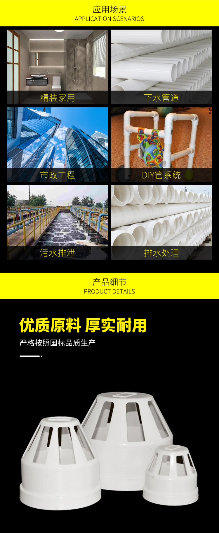 包装清单:1PVC透气帽罩排水管透气网罩出风排气 PVC下水管配件50 75 110 160