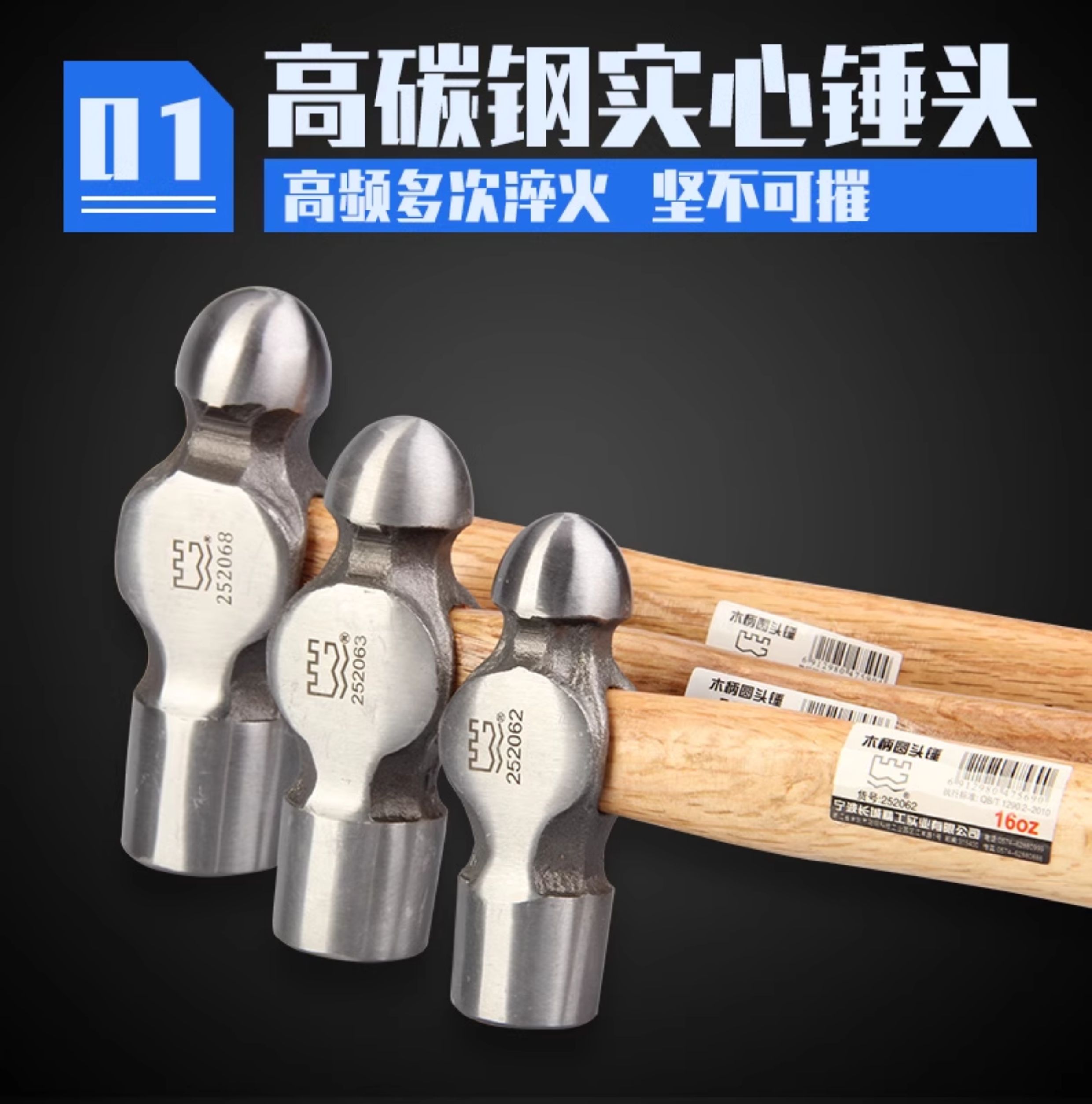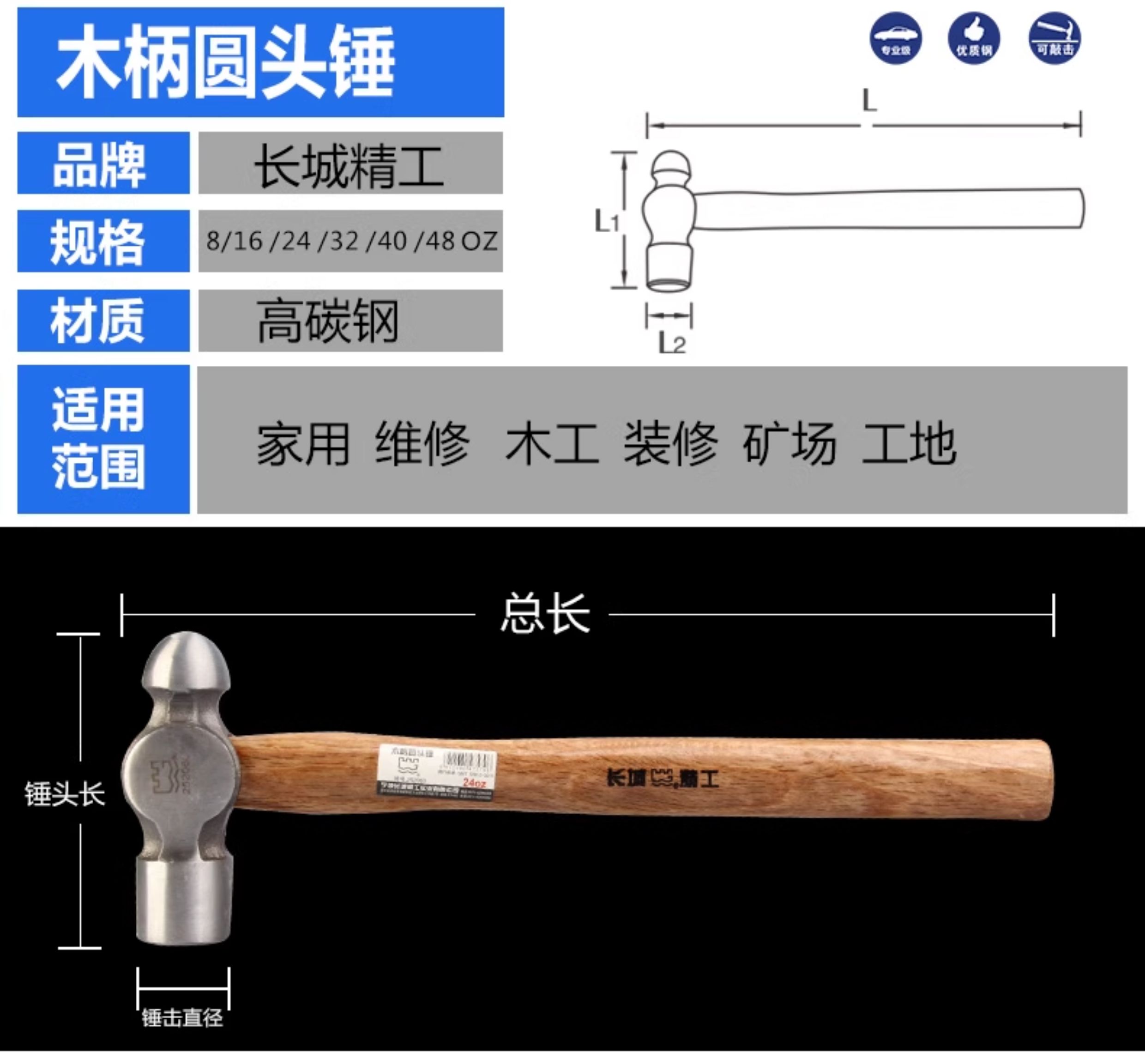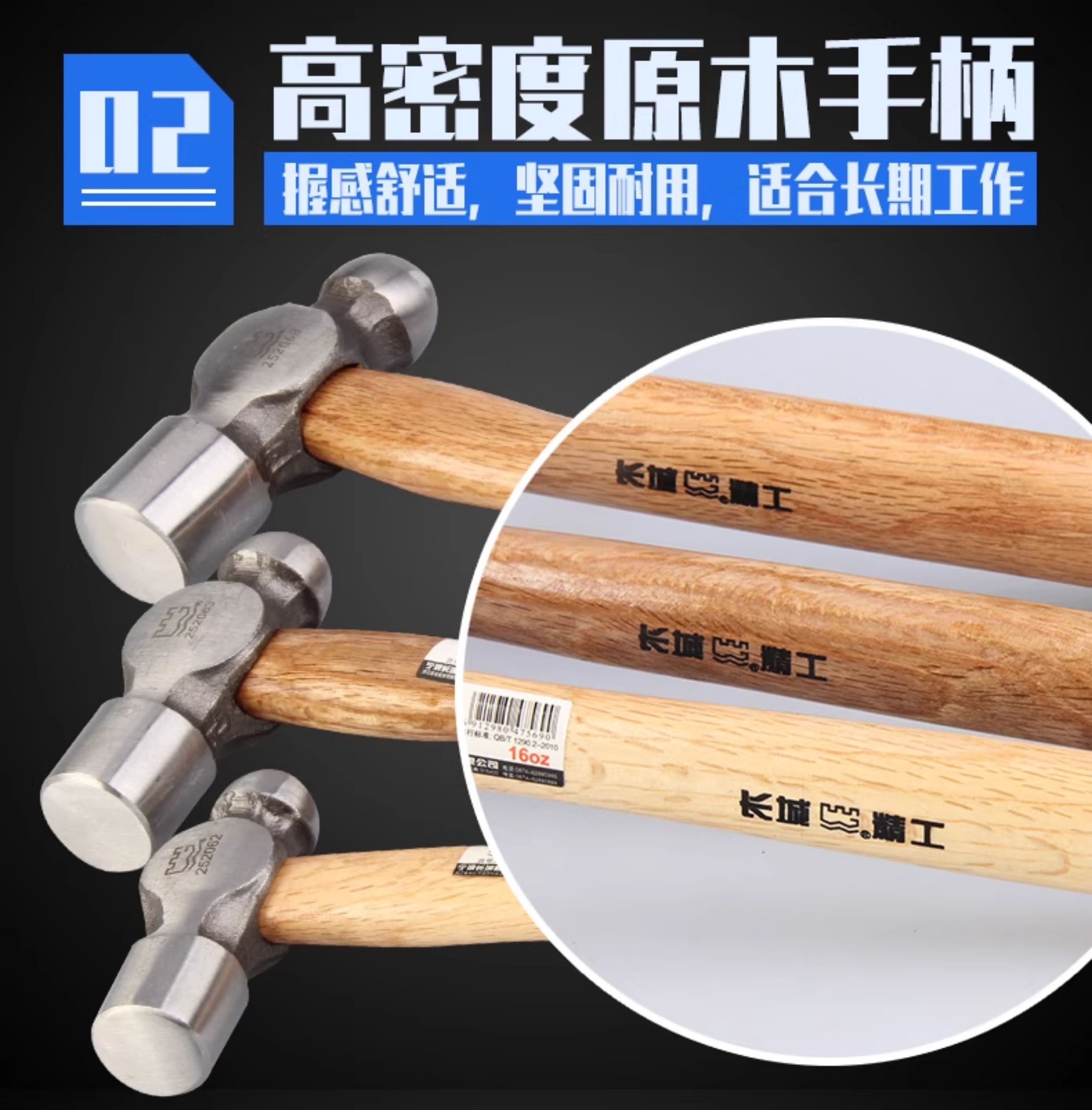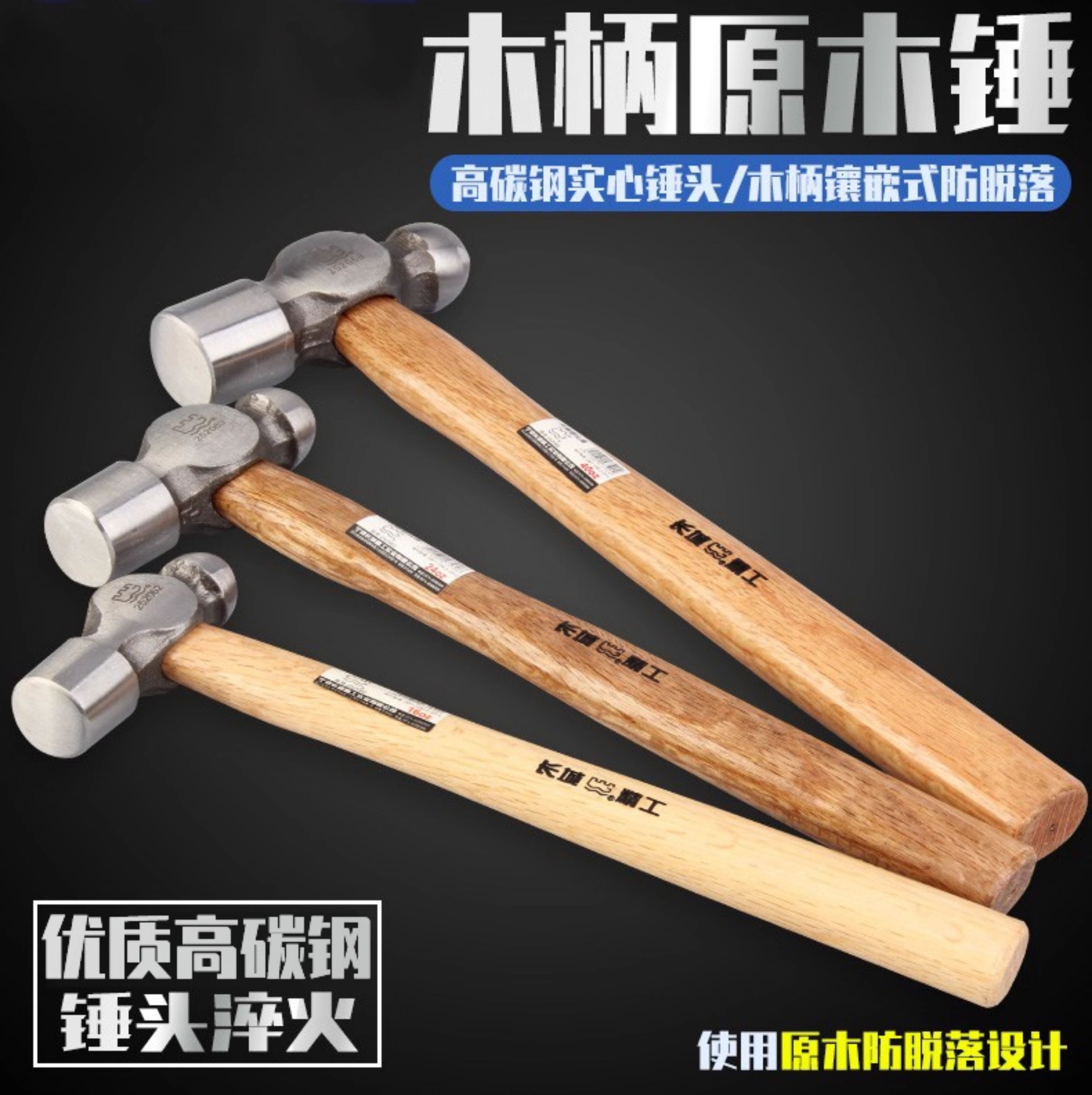 长城精工铁锤子榔头纯钢木柄圆头锤工业级手锤奶子锤工具1/2/3磅