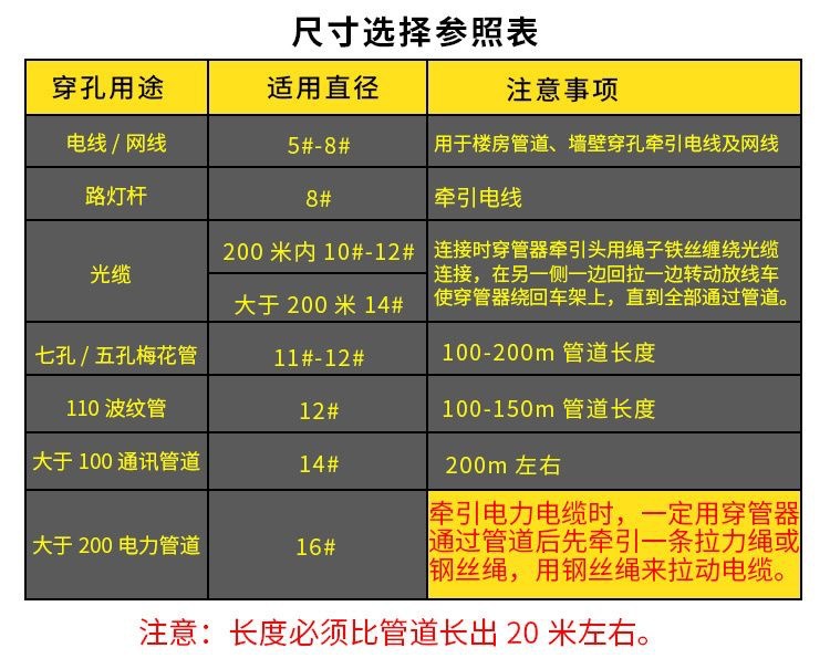 包装清单:1光缆电缆穿管穿孔器 管道疏通器 电工专用光缆穿线器