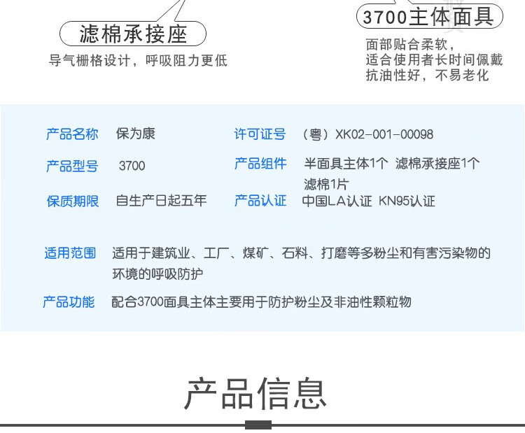 包装清单:1保为康3700防尘面具透气防颗粒呼吸器粉尘口装修打磨灰尘专用面罩
