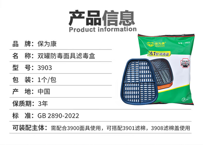 商品名称:保为康3903滤毒盒防毒面具滤盒活性炭防油漆味汽油化工防护防毒口罩配件