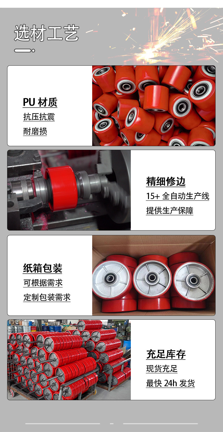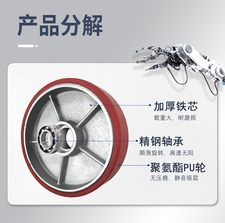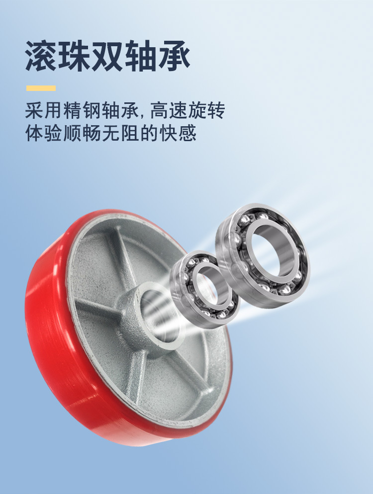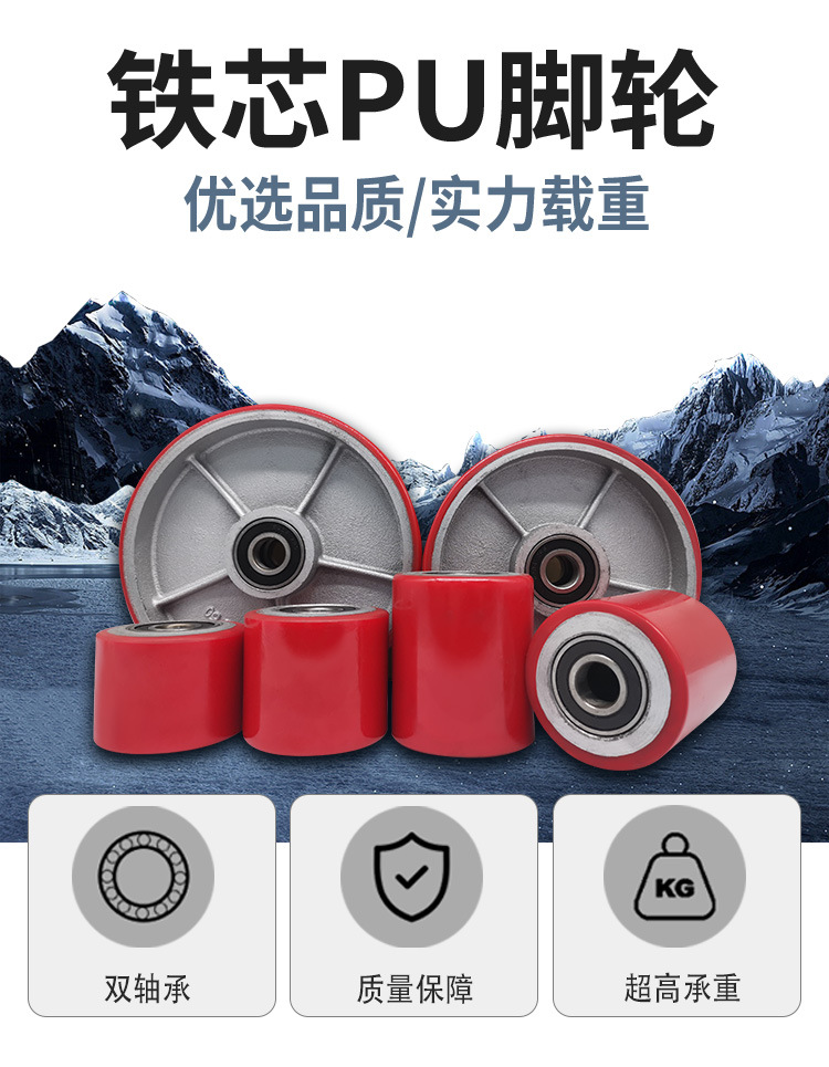 商品名称:手动液压叉车轮子红色铁芯PU带轴承脚轮高载重低噪音耐磨滚轮滑轮
