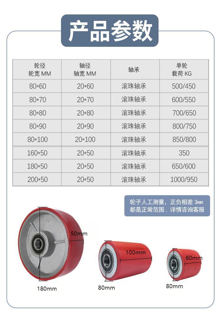 包装清单:1手动液压叉车轮子红色铁芯PU带轴承脚轮高载重低噪音耐磨滚轮滑轮