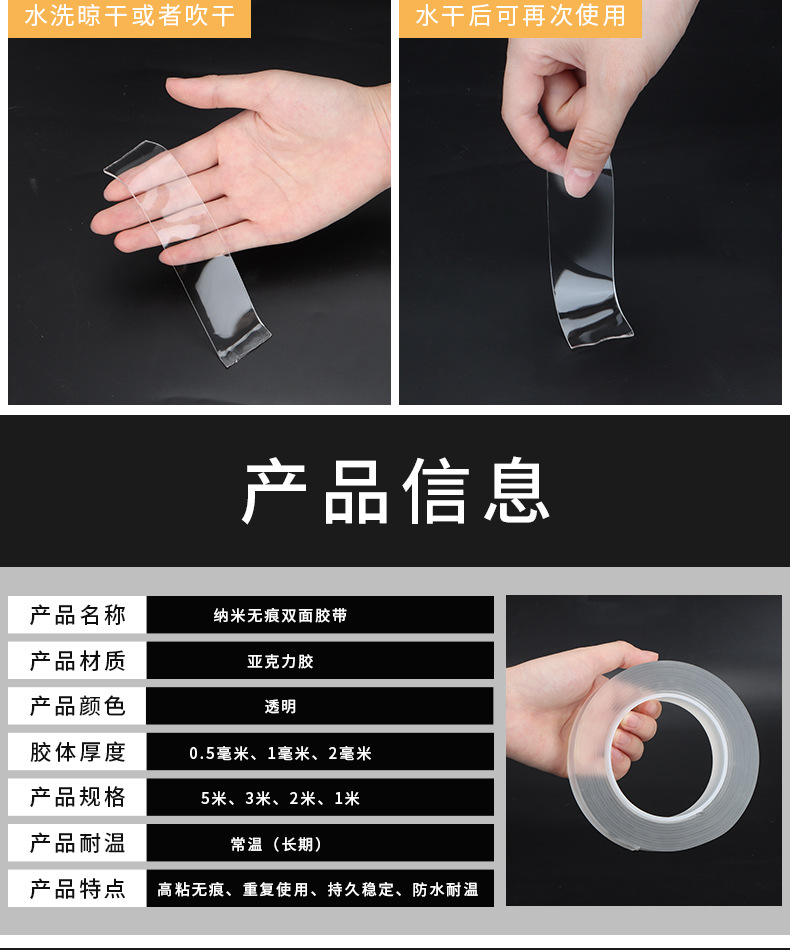 包装清单:1纳米双面胶带无痕透明亚克力双面胶抖音魔力胶高粘度防水纳米胶带
