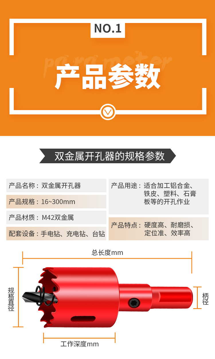商品名称:木工开孔器双金属开孔器M42石膏板塑料铁板金属木工钻头扩孔器