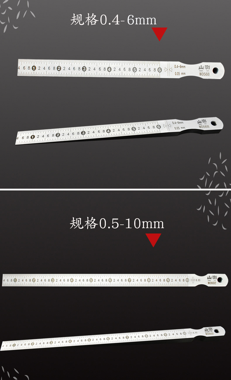 包装清单:1楔形塞尺缝隙间隙测量游标斜面 0.2-4 0.4-6 0.5-10 1-15mm