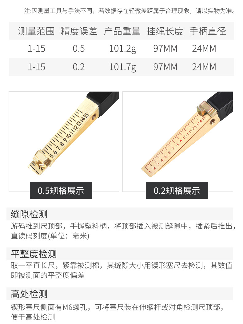 包装清单:1楔形游标塞尺缝隙尺高精度间隙尺塞规0-15mm锥形塞尺验房工具