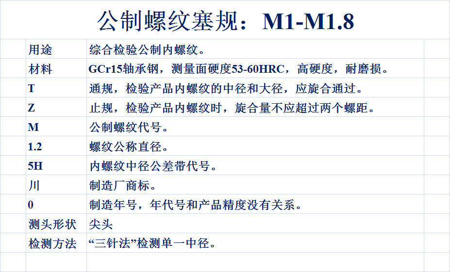 包装清单:1螺纹塞规6H通止规牙规公制粗细牙量规M1M1.2M1.4M1.6M1.8M2M5