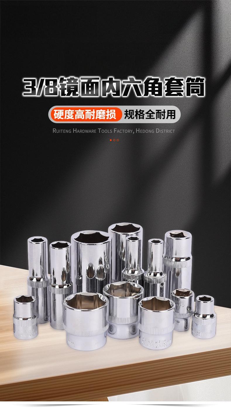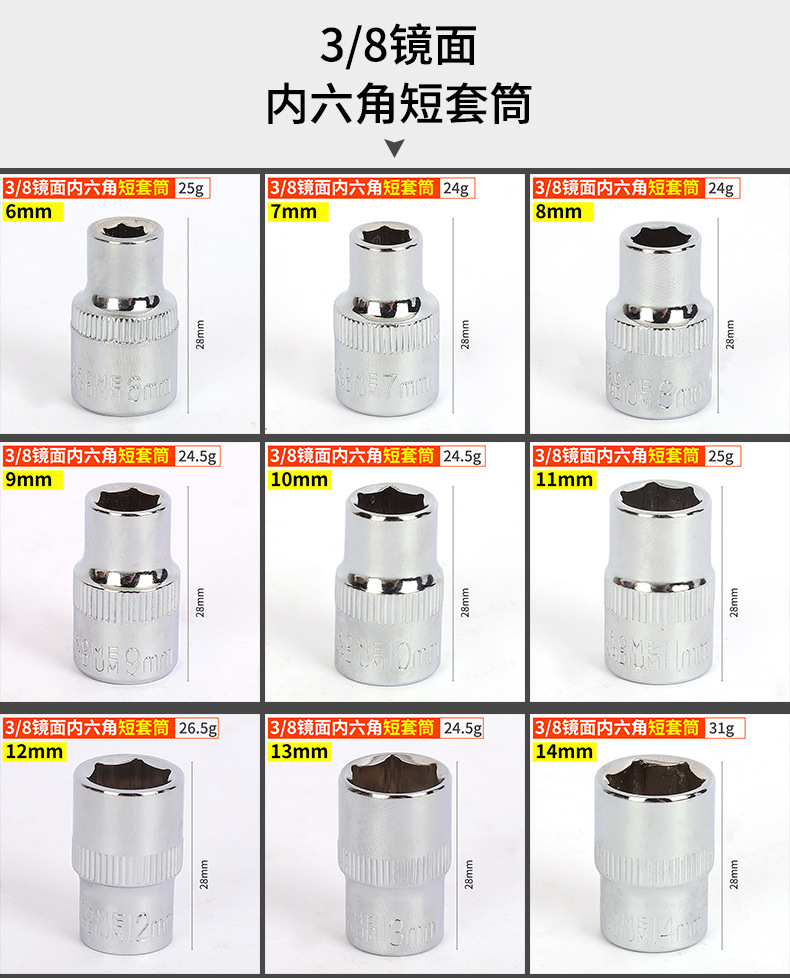 商品名称:3/8六角套筒10mm系列6角中飞短套头铬钒钢镜面公制套筒头