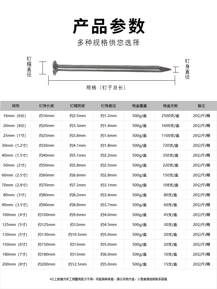 包装清单:1合恒工品铁钉圆钉洋钉木工钉圆钢钉8分1寸1.5寸2寸3寸4寸6寸