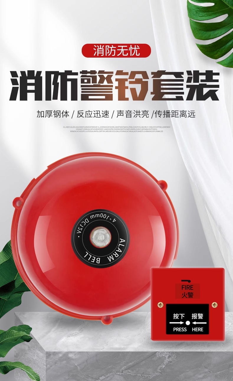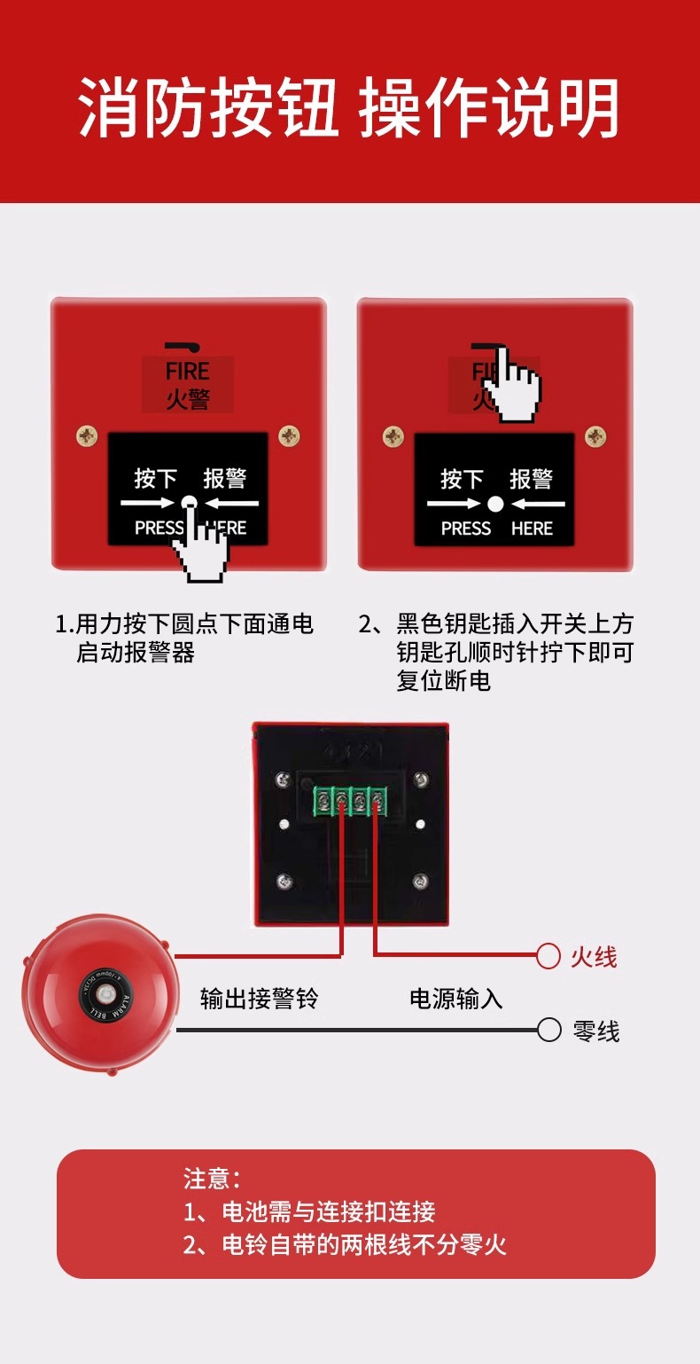 包装清单:1桂安消防电铃消防警铃220V手动报警铃火警火灾警报器电铃铛家用干电池应急按钮