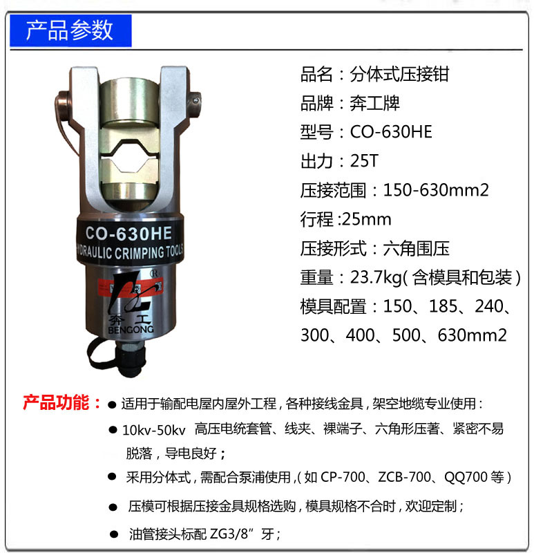 包装清单:1CO-630HE分体式液压钳铜端子压接钳 德式压线钳150-630