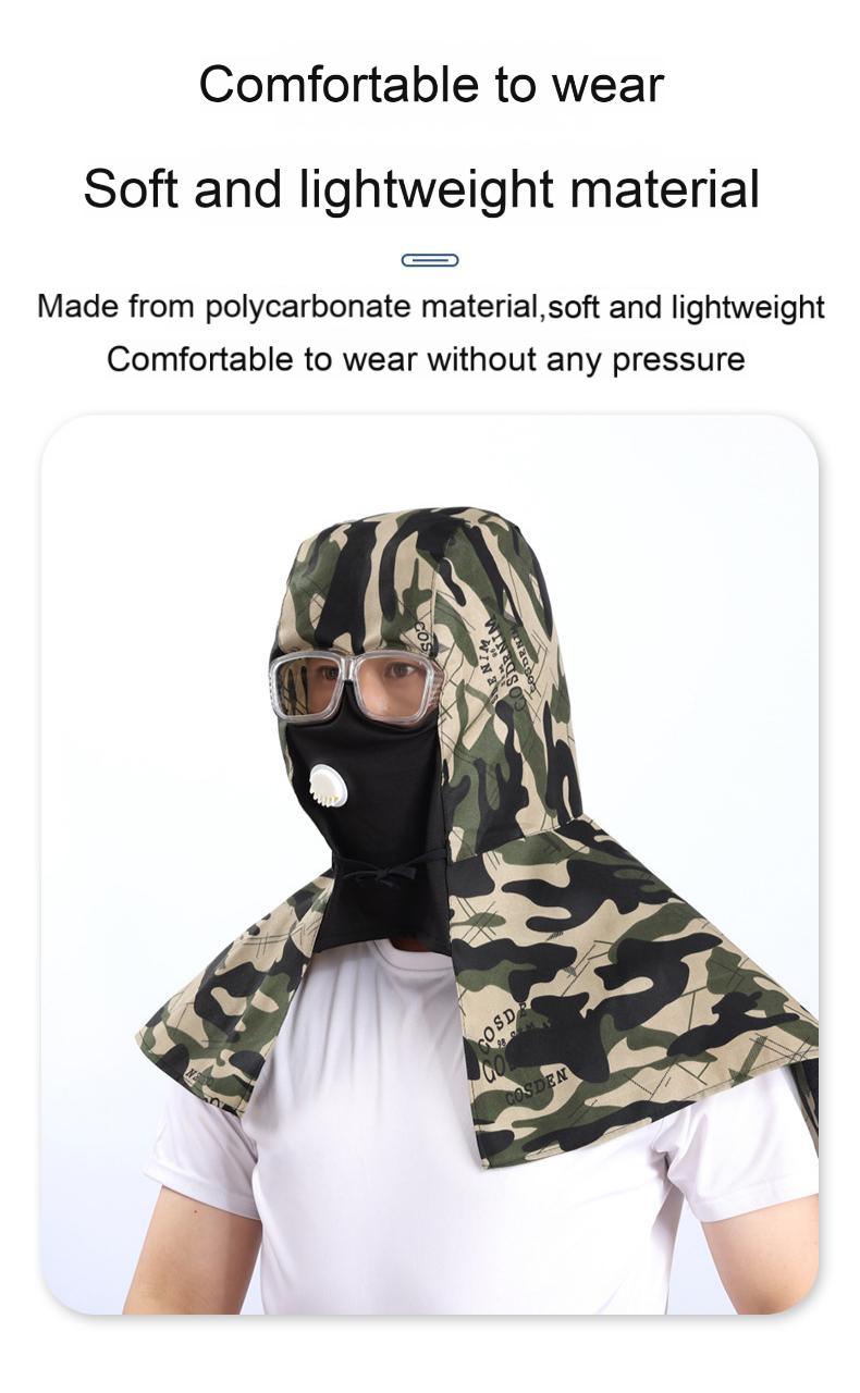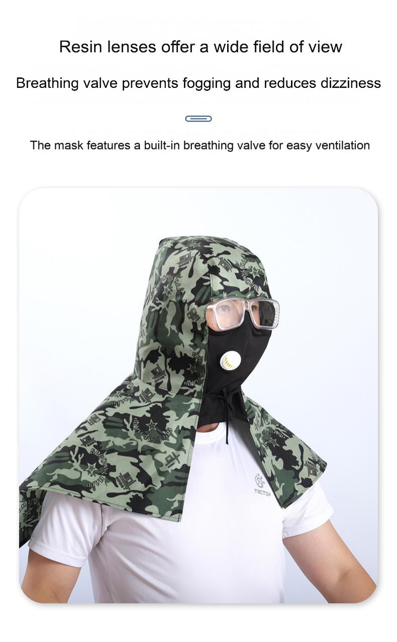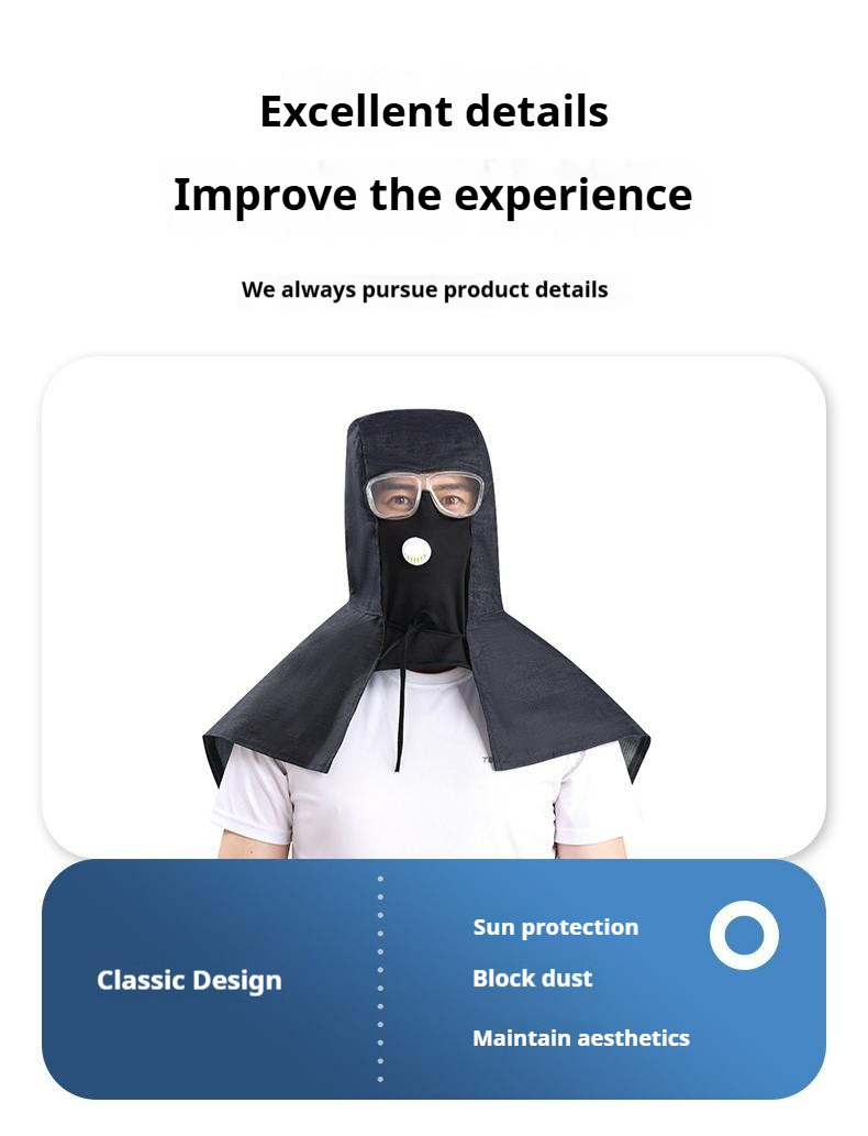 Product name:Dust-proof hood with head protection, shawl cap, large eye shield, breathable valve, unisex design, safety workwear, sun protection hood, wind cap