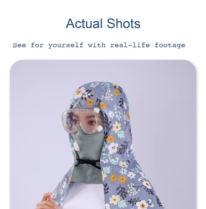 Packing list:1Dust-proof hood with head protection, shawl cap, large eye shield, breathable valve, unisex design, safety workwear, sun protection hood, wind cap