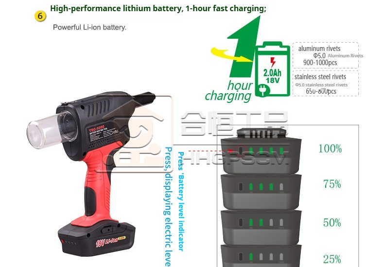 Product name:TDC5000 Electric Rivet Gun Lithium-Ion Rivet Gun Electric Riveting Tool