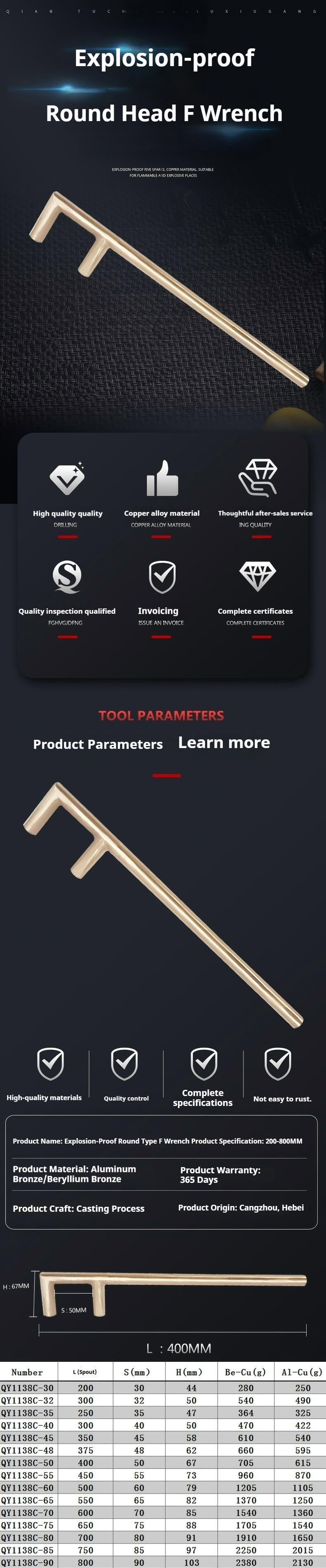 Packing list:1Explosion-proof Copper Alloy Round-Head F-Type Wrench Tool Aluminum Bronze/Beryllium Bronze Two-Jaw Valve Plate Spark-Free Hardware