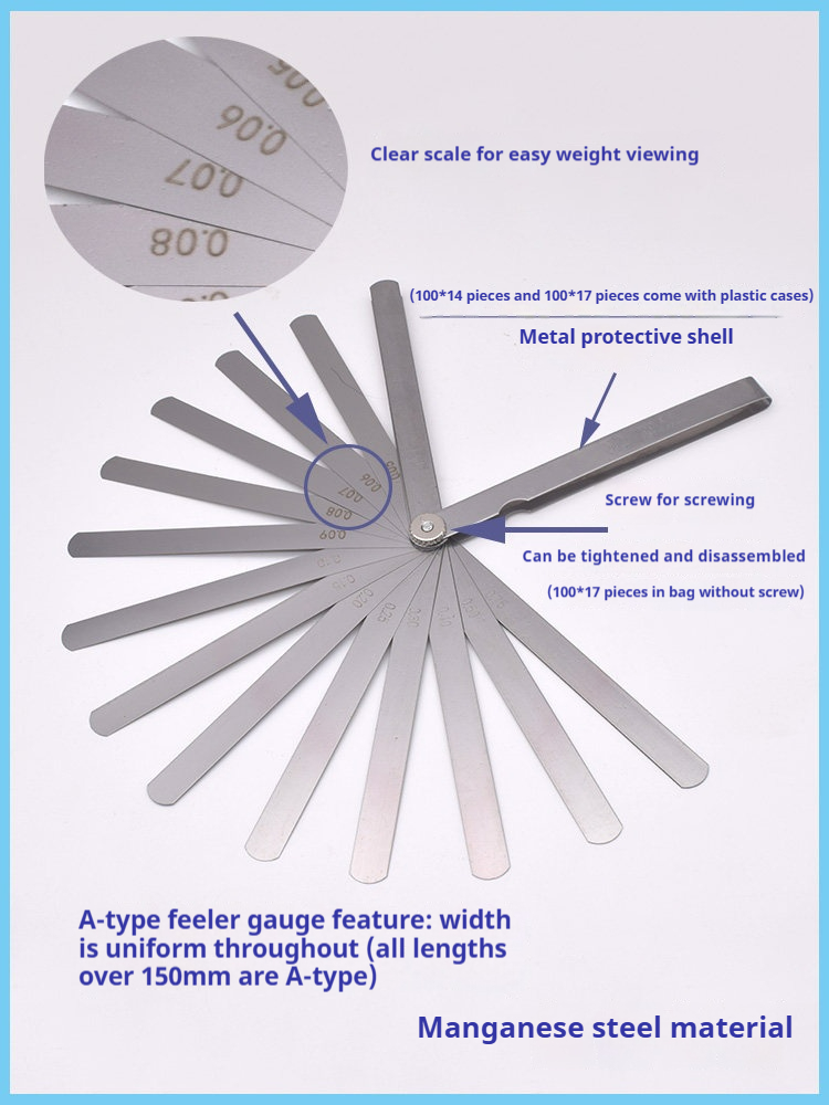 Packing list:1Feeler Gauges 0.02-1.0mm for Adjusting Valve Clearance Feeler Gauges: 14-piece, 17-piece, 20-piece, 23-piece, 26-piece