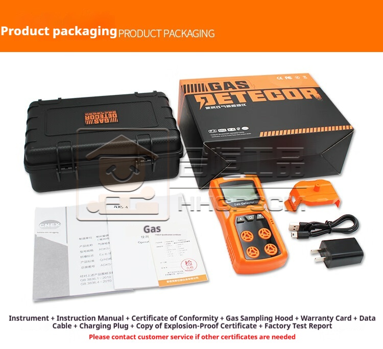 Packing list:1Four-in-One Gas Detector: Combustible, Oxygen, Carbon Monoxide, Hydrogen Sulfide, Confined Space Hazard Gas Alarm