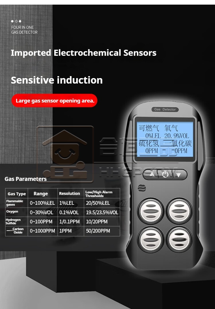Packing list:1Four-in-One Gas Detector Portable Oxygen CO Hydrogen Sulfide Combustible Confined Space Concentration Alarm Four-in-One (X-4+)