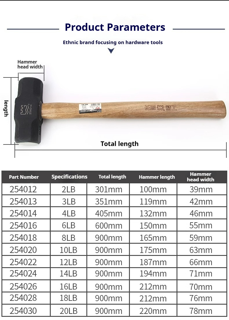 Packing list:1Solid steel octagonal hammer with wooden handle Heavy-duty sledgehammer Square-head 3/4/6/8/10/12/20 lb
