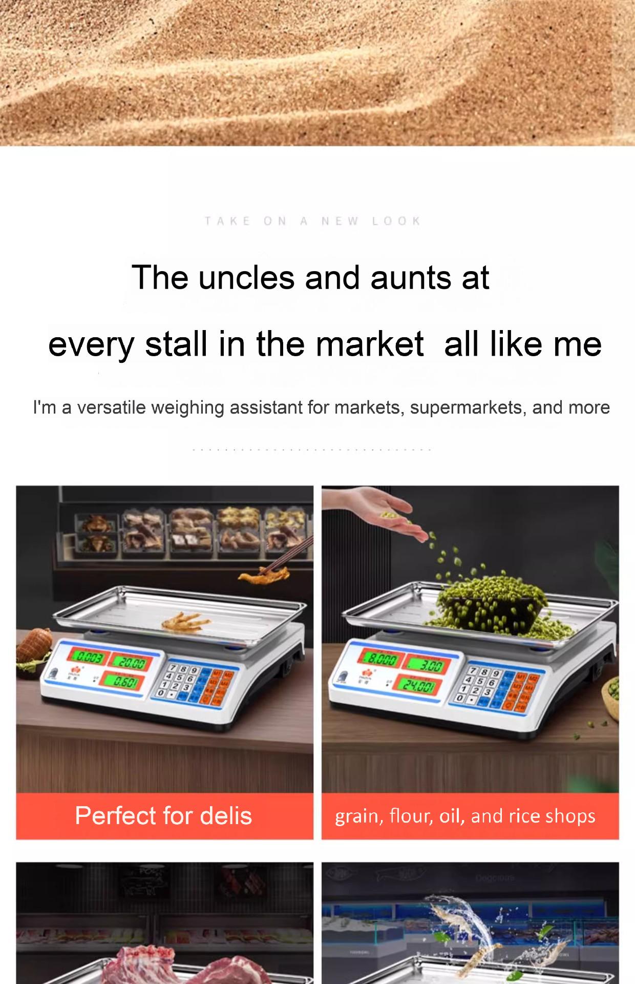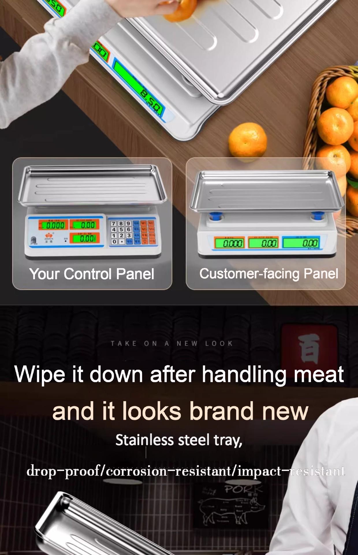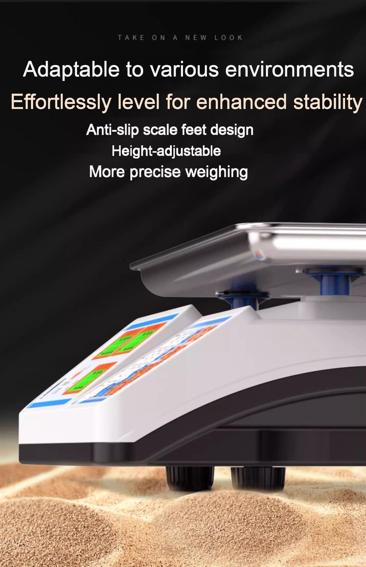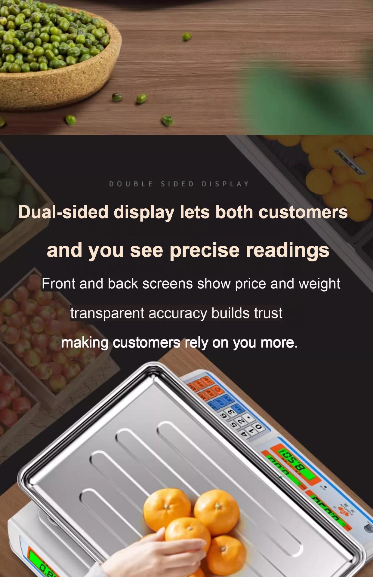 Packing list:1Commercial-grade weighing scale with high-precision counting and weighing Waterproof kilogram scale for vegetable and fruit markets Dual-display design suitable for street vending