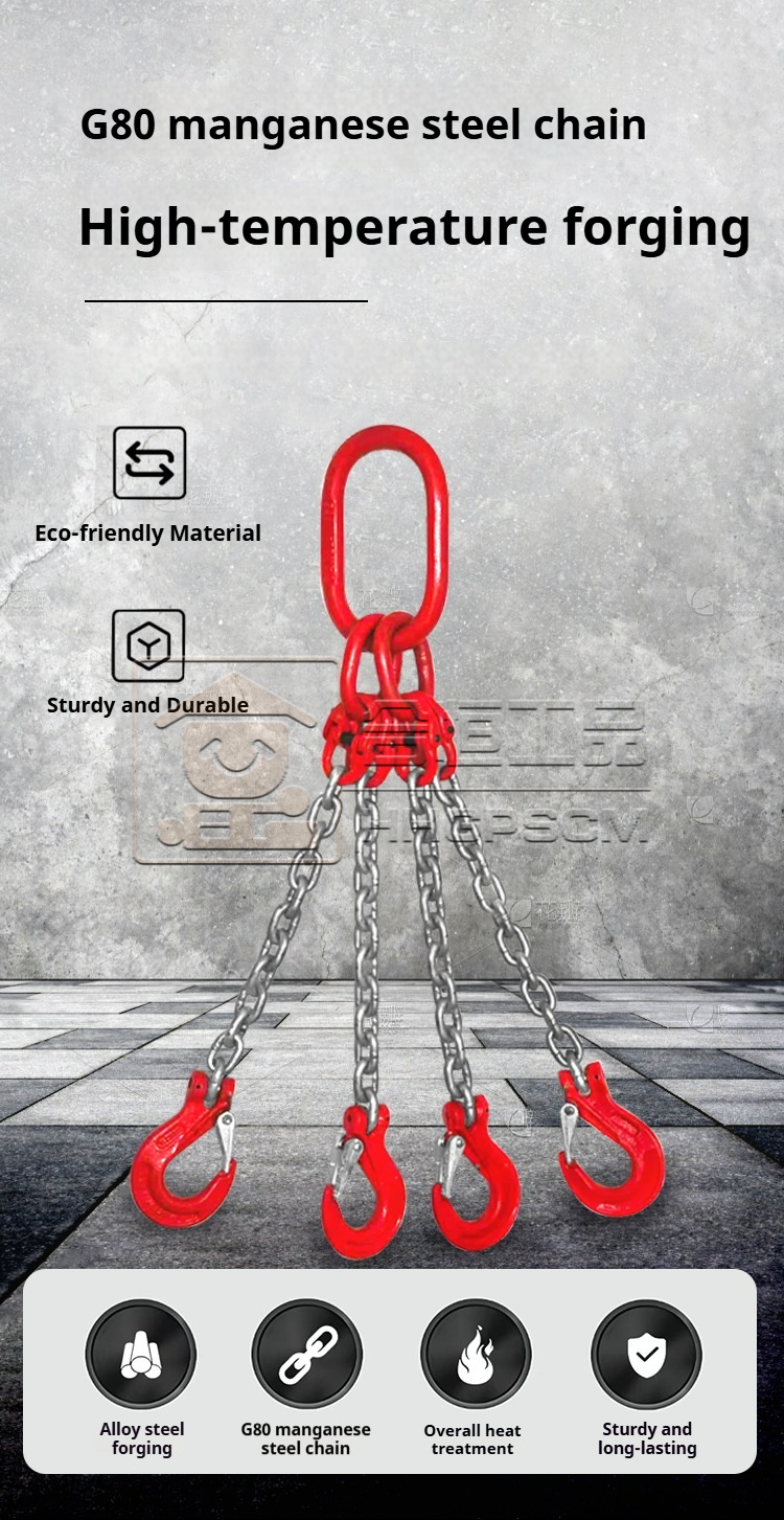 Complete sets of lifting slings, double-leg and quad-leg lifting chains, G80 chain hooks, lifting rings, and combination lifting devices—customizable in multiple specifications.