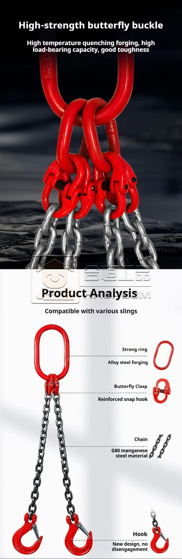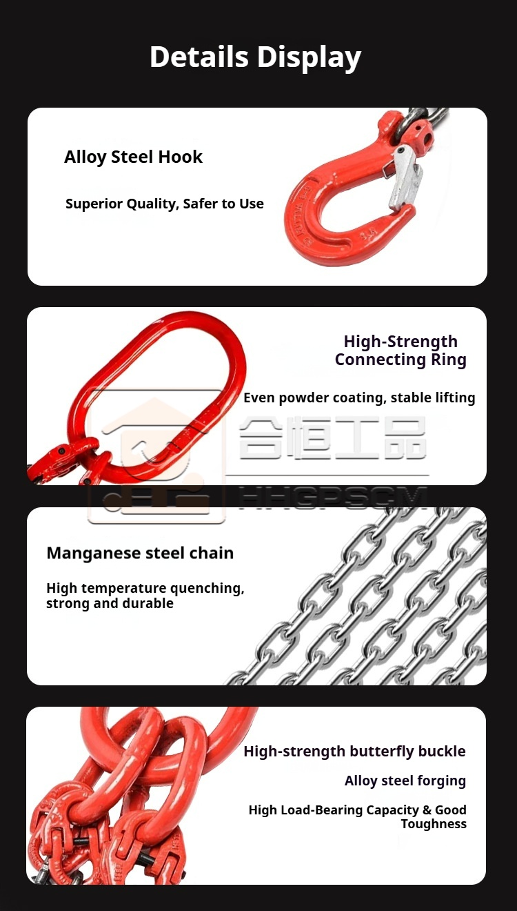 Packing list:1Complete sets of lifting slings, double-leg and quad-leg lifting chains, G80 chain hooks, lifting rings, and combination lifting devices—customizable in multiple specifications.
