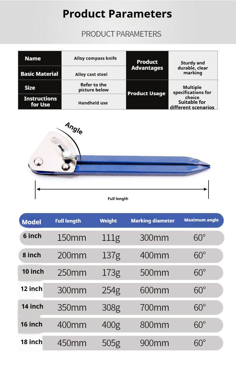 Packing list:1Drafting Compass for Precision Machinists Industrial-Grade Tungsten Carbide Alloy Large-Size Iron Scribing Tool Woodworking Machinery Marking Essential Drawing Compass