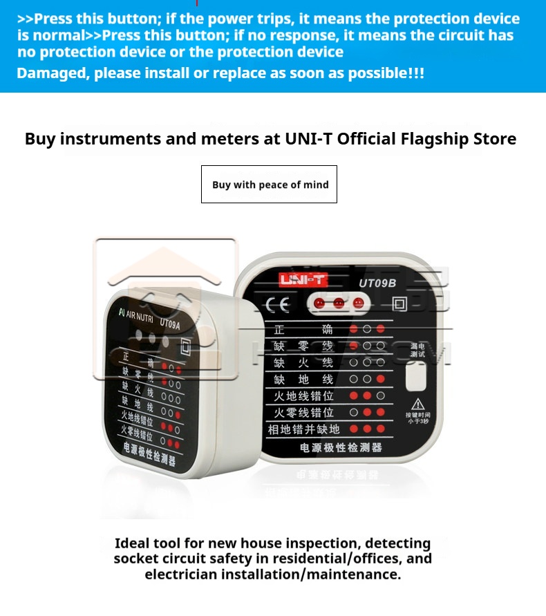 Packing list:1UT09A/09B Socket Tester: Ground, Neutral, and Live Wire; Plug Polarity Tester; Phase Detection